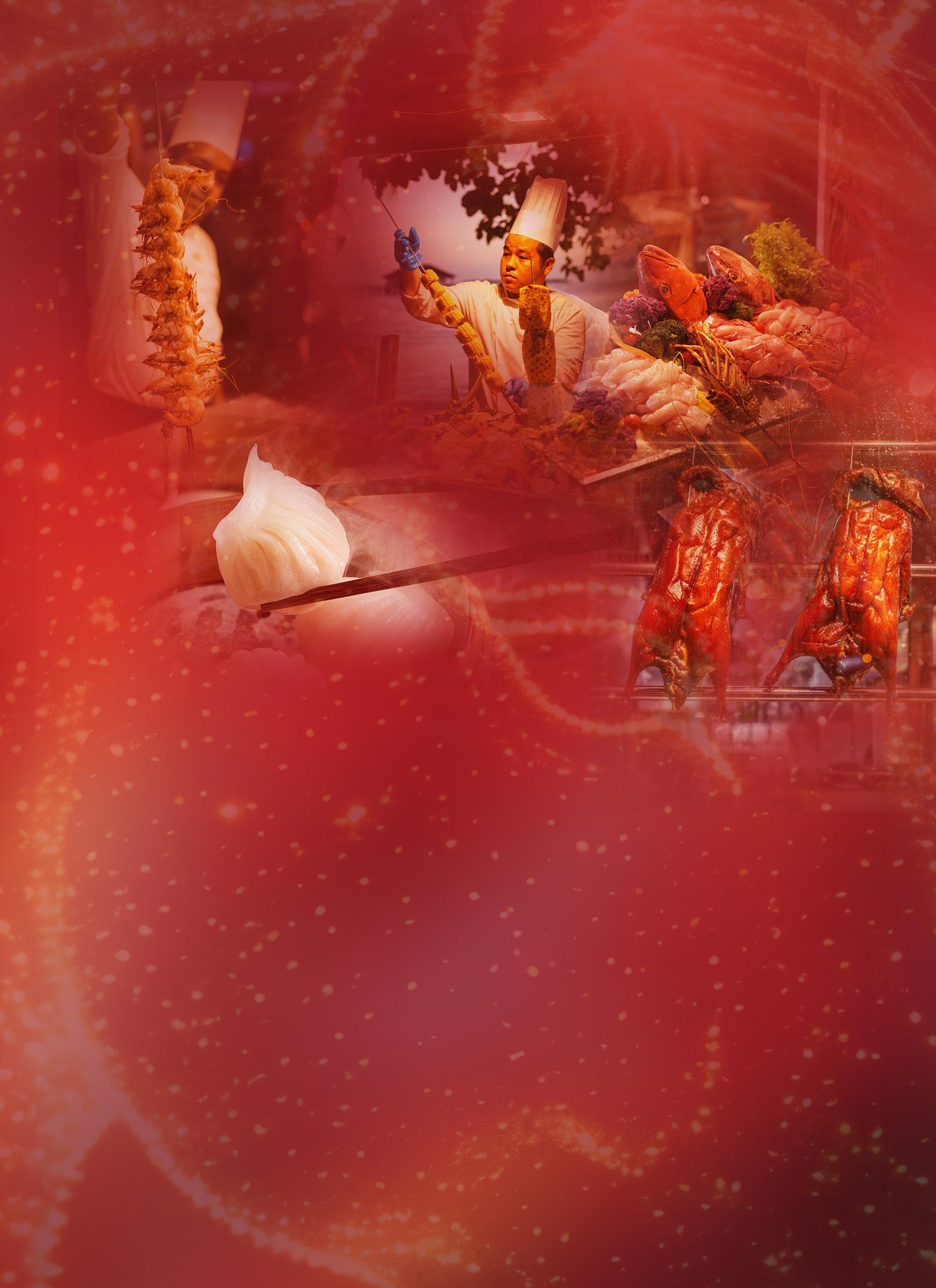 An elevated pan-Asian feast celebrating Chinese cuisine, featuring live cooking stations, premium seafood, and refined regional flavors. Highlights include Peking duck, whole baby pork, Chongqing-style crab, sweet and sour seafood, baked fish, raw selections, dim sum, interactive wok noodles, and crisp tempura.