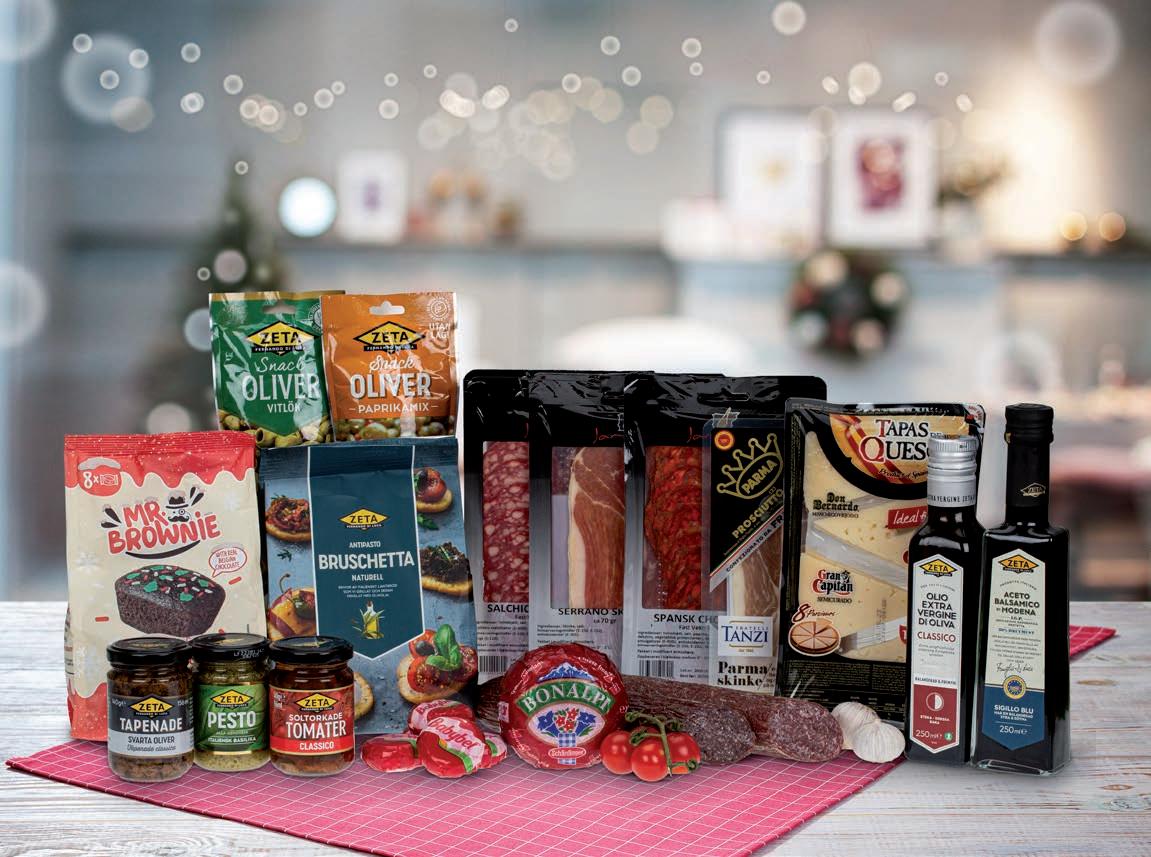 Innhold: Bruschetta Naturell 175g, Babybel mini 120g, Pesto alla Genovese 140g, Mr. Brownie Cakes 8 x 25g, Parmaskinke 14 mnd skivet 80 g, Salchichon Spansk Salami skivet 80g, Serranoskinke skivet 70g , Skaupølse m/ elg & blåbær 270g, Snack Oliven Paprikamix 70 g, Tapenade Sorte Oliven 140g, Olivenolje Ex verg Classico 250ml, Ostebrett 8 stk. Spanske oster, Chorizo Spansk skivet 70g, Grønne snack oliven hvitløk 70g, Soltørkede Tomater 140g, Edamer rund 250g, Balsamico 250ml, Rødvinspølse 260g.