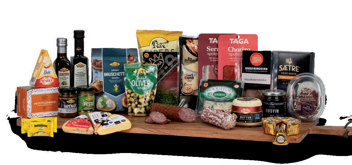 Innhold Sætre Beste spelt kjeks 100g, Bruschetta naturell 175g, Rødvinsgele Gourmet Lisa 280g, President Camembert 250g treeske, Parmaskinke 14 mnd. Scopri Il Gusto 40g, President Brie 125g, Ostebrett 8 stk. Spanske oster 180g, Rødvinspølse 200g, Salchichon Spansk spekepølse 225g, Serrano skinke skivet 55g, Chorizo Spansk skivet 100g, President Gourmet Butter Sea Salt 250g, Fuet skivet Spansk spekepølse oppskjært 80g, Gröna snack oliven vitlök 70g, Roqueforte 100g, Røros Juleost 90g, Olivolja Ex Verg-Classico 0,25, Balsamico 250 ml, Pesto Alla Genovese 140g, Tapenade sorte oliven 140g, Potetflatbrød 210g, Røros ost med reinskjøtt 90g, Røros velagret kvitost 90g, Leerdamer ost mini 3 stk 66g, Pipers Cheddar & Onion 40g, Westfaler spekeskinke 70g, Aksie fjøl 95 cm.