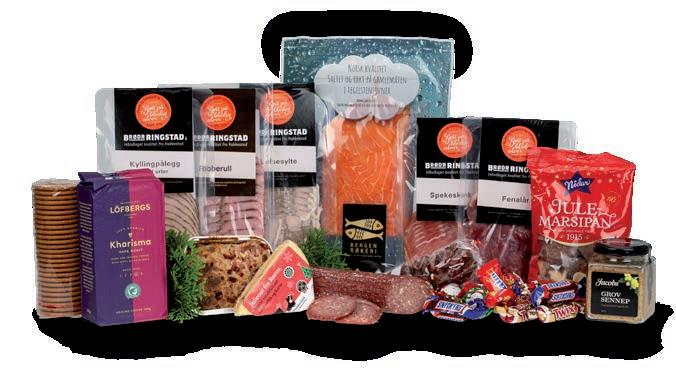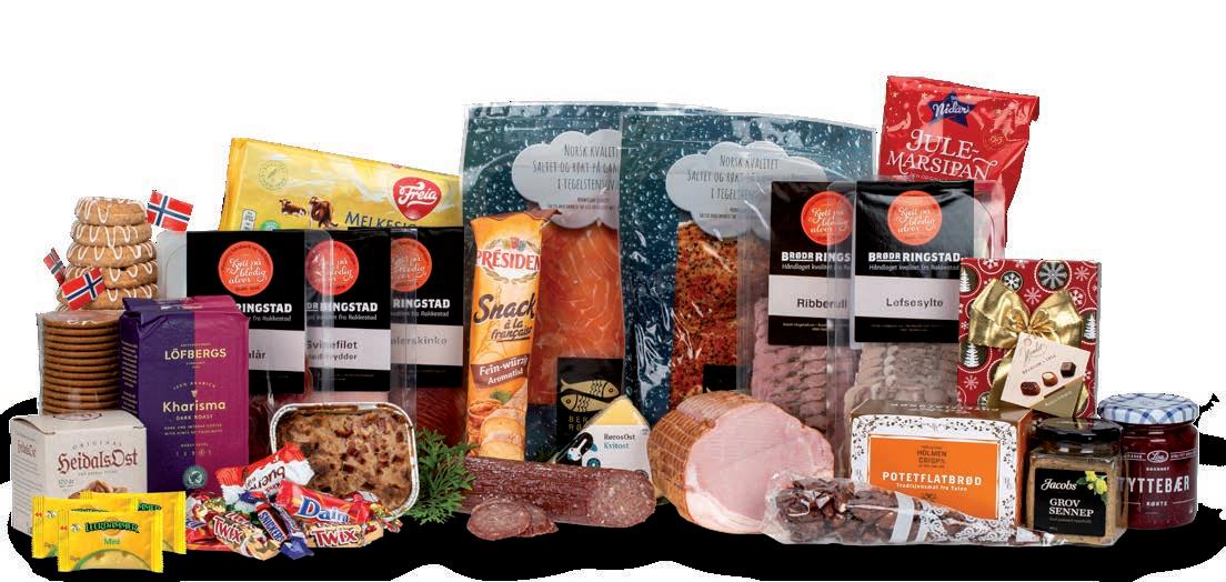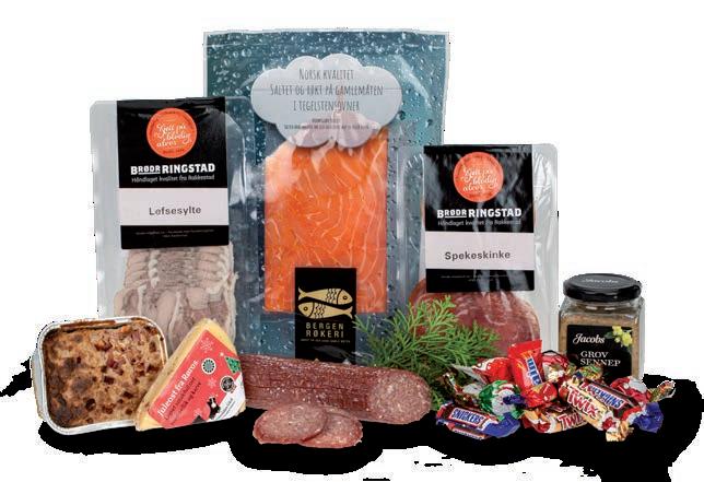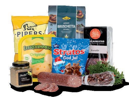 Jacobs sennep Grov 180g, Rødvinspølse 200g, Norsk Spekeskinke skivet 75g, Julemiks innpakkede sjokoladebiter 150g, Røkt Laks skivet 100g, Løfbergs julekaffe 250g, Kyllingpålegg m/urter skivet 100g, Pepperkaker 150g, Ribberull 100g, Ringstad Fenalår 100g, Holmens brente mandler 100g, Nidar Julemarsipan 138g.