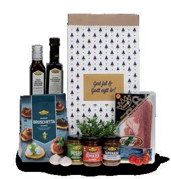 Innhold: Ostebrett 8 stk. Spanske oster 180g, Pesto alla Genovese 140g, Parmaskinke 14 mnd. Scopri Il Gusto 40g, Salchichon Spansk salami skivet 100g, Serrano skinke skivet 55g, Bruschetta naturell 175g, Grønne snack oliven hvitløk 70g, Nisse Laica 150g Italienske sjokoladekuler, Fuet skivet Spansk spekepølse oppskjært 80g, Chorizo Spansk skivet 100g, Tapenade sorte oliven 140g, Olivolja Ex Verg-Classico 0,25, Leerdamer Ost mini 3 stk 66g, President snacking Brie 180g, Soltørkede tomater 140g, Hamlet Julekonfekteske m/sløyfe 125g.