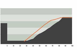 El gráfico muestra las diferencias entre los tres sistemas de disparo: sistema hidráulico; muelle y la ballesta Kubota. Se muestra el incremento de esfuerzo de levante cuando el cuerpo supera un obstáculo.