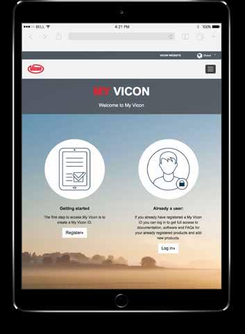 A personalised online platform tailored to your machine needs With MYVICON you will benefit from easy access to Vicon’s online service tools. Receive first hand access to information on future developments and updates, operator and spare part manuals, FAQs and local VIP offers. All information is gathered in one place.