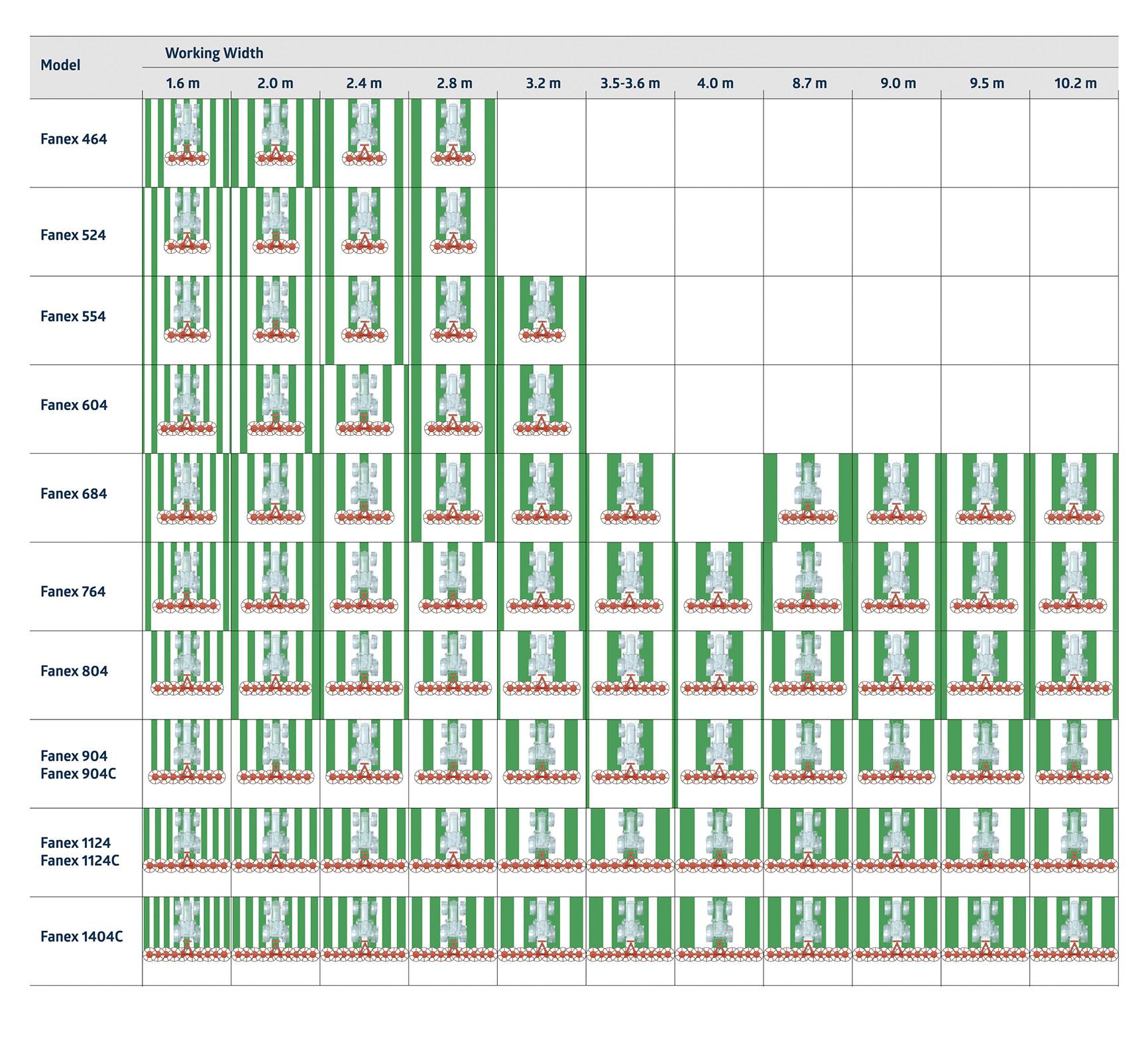 på åtta meter, ringvälten på 16 meter, gödningsspridaren med 24 meters arbetsbredd och växtskyddssprutan på 48 meter.