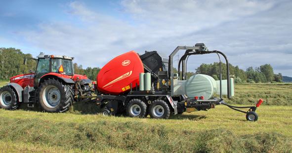 Flexkammarpress med integrerad inplastare, FlexiWrap. Kraftigt tandemchassi med 560/45-R22.5 hjul som stan dard. Det ger mycket god stabilitet. FlexiWrap kombinerar hög baldensitet med snabb och säker balöverföring. Snabb dubbelsatellitinplastning. Allt kontrolleras med Isobus.