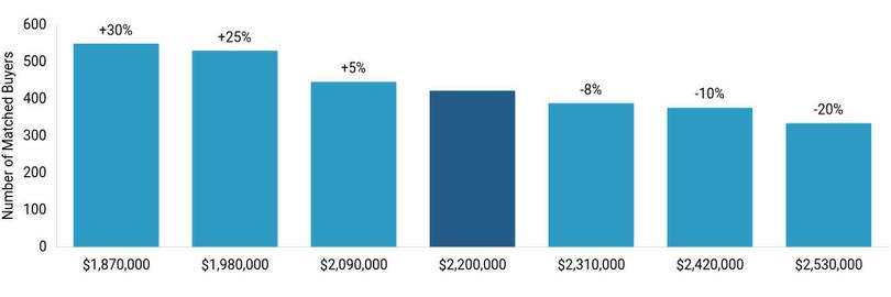 A complete, data-driven pricing strategy should consider the relative quantity of buyers who would match this listing at various price points. This report shows how adjustments to list price may impact the amount of exposure your home will receive. Buyers included below are among the highest-intent home shoppers, because each of them is represented by an agent on the RealScout platform