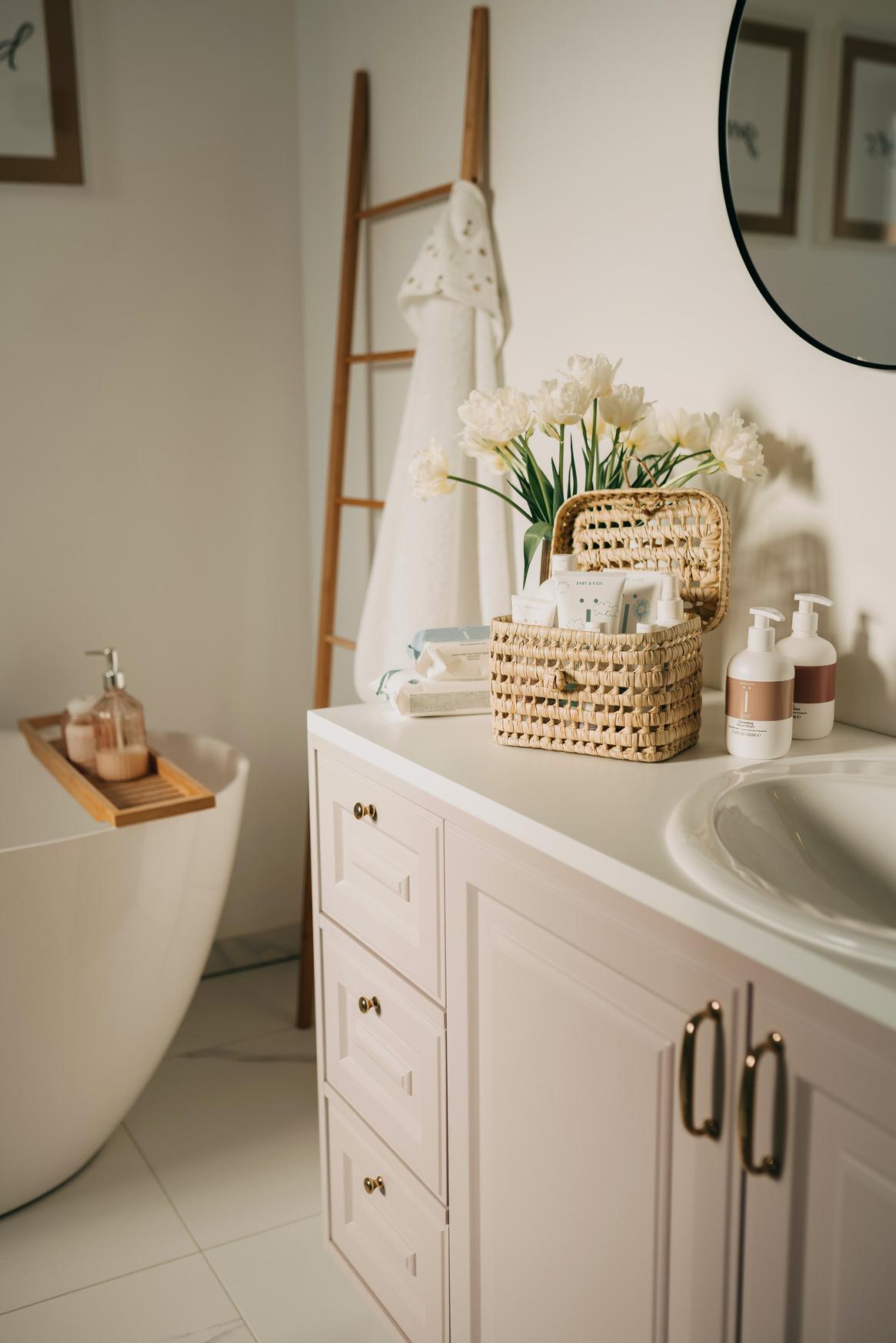 Sherwin-Williams' Rosebud for a touch of romance in laundry rooms. The dusty pink hue, paired with gold accents, adds a luxurious and warm atmosphere.