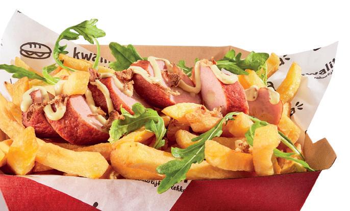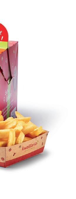 Gebruik een Kwalitaria friet special snackbox met Kwalitaria inlegvel en geef een servet mee.