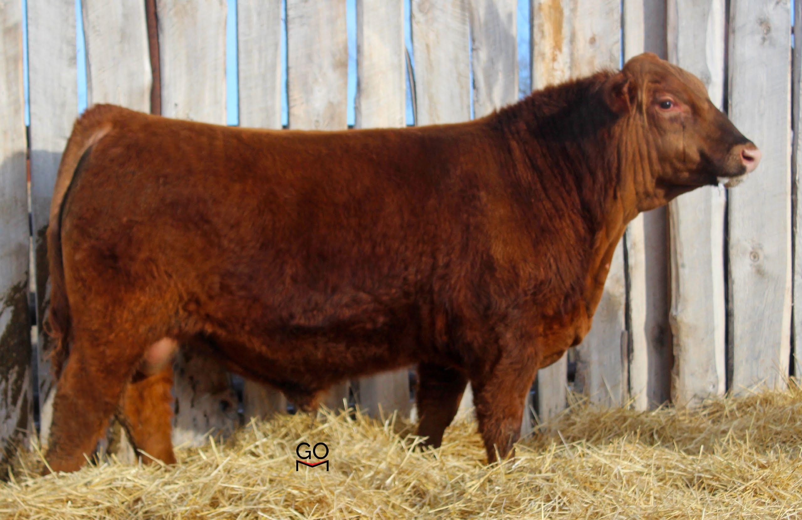 Red Gomack Rebel 33J has calving specialist written all over him, from his pedigree, to his strong muscular frame, smooth shoulders, and length. Rebel grabs a lot of attention where ever he goes sitting on perfect feet. Being structurally sound, he is the Ultimate calving ease Bull. His sire Ice Man 260D had dependable, proven calving ease and an outcross pedigree. Combined with a Cheroviann Dam 74B, the ultimate cow family dating over 50+ years, no wonder he has extra- performance and is incredible. Don’t miss out on this opportunity to add consistent calving ease, structurally sound genetics to your herd. CAN & US Qualified