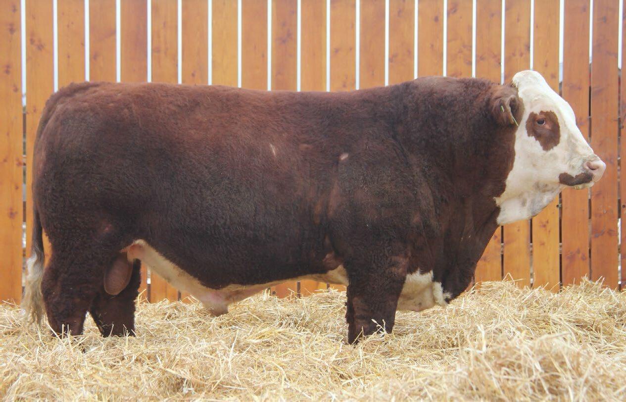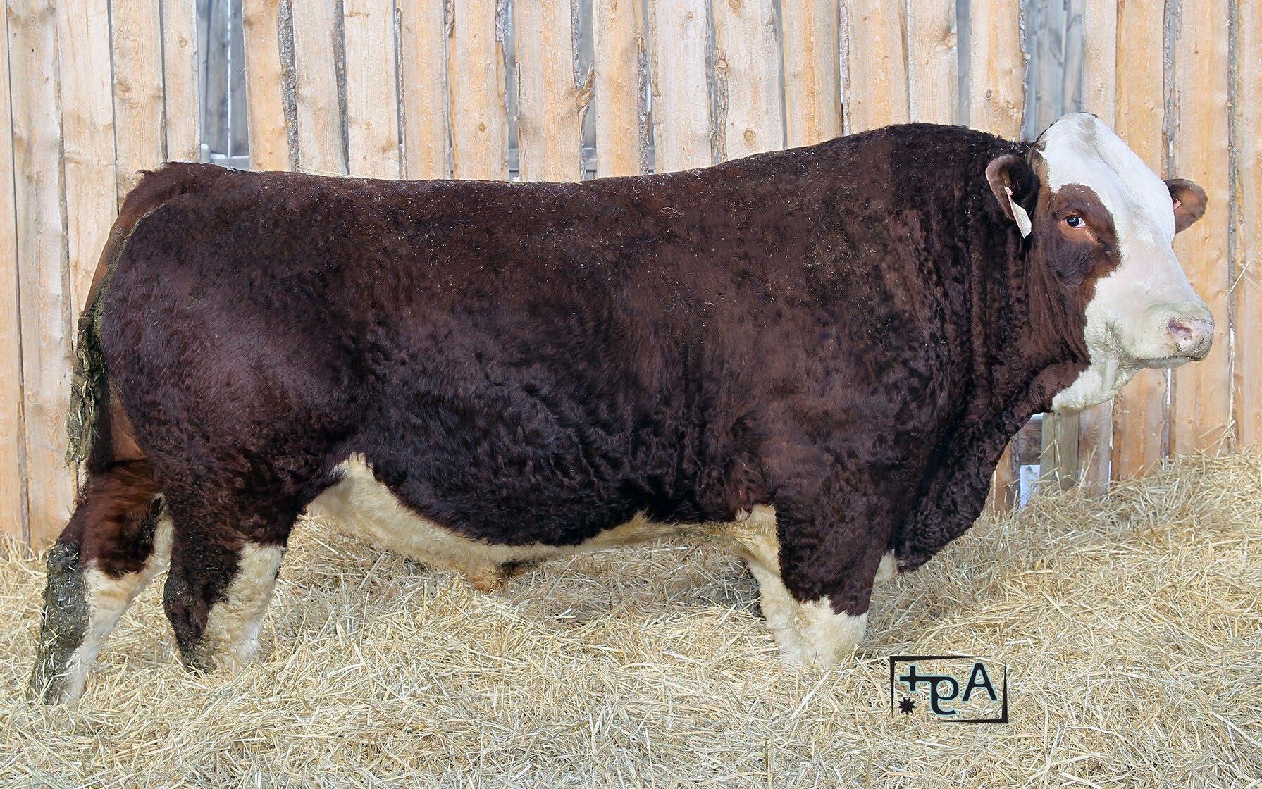 Full Fleckvieh If you’re in the business of raising big steers and beautiful momma cows, then this is the bull for you! 15J is long as a freight train, has great bone, is extremely docile and his natural muscling ability is impeccable. He is sure to sire calves that will be quick in growth while adding some frame to calves who will push that scale down in the fall. 15J’s dam, Ricochet Emily 703E, is a maternal workhorse of a cow with a great udder, spring of rib and natural muscling. 15J has a sister working in Ontario at Toad Hall Simmentals and one at home, not enough good things can be said about them. With the likes of Benchmark, JNR’s Warrior and BHR Doorn, 15J has the pedigree to be great! With very high milk and MWWT numbers, this is a perfect bull for the commercial cattleman!