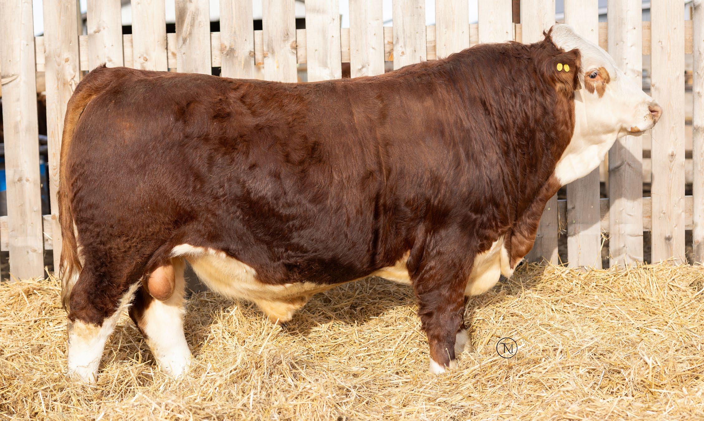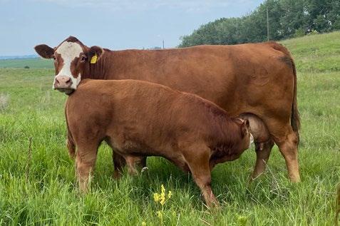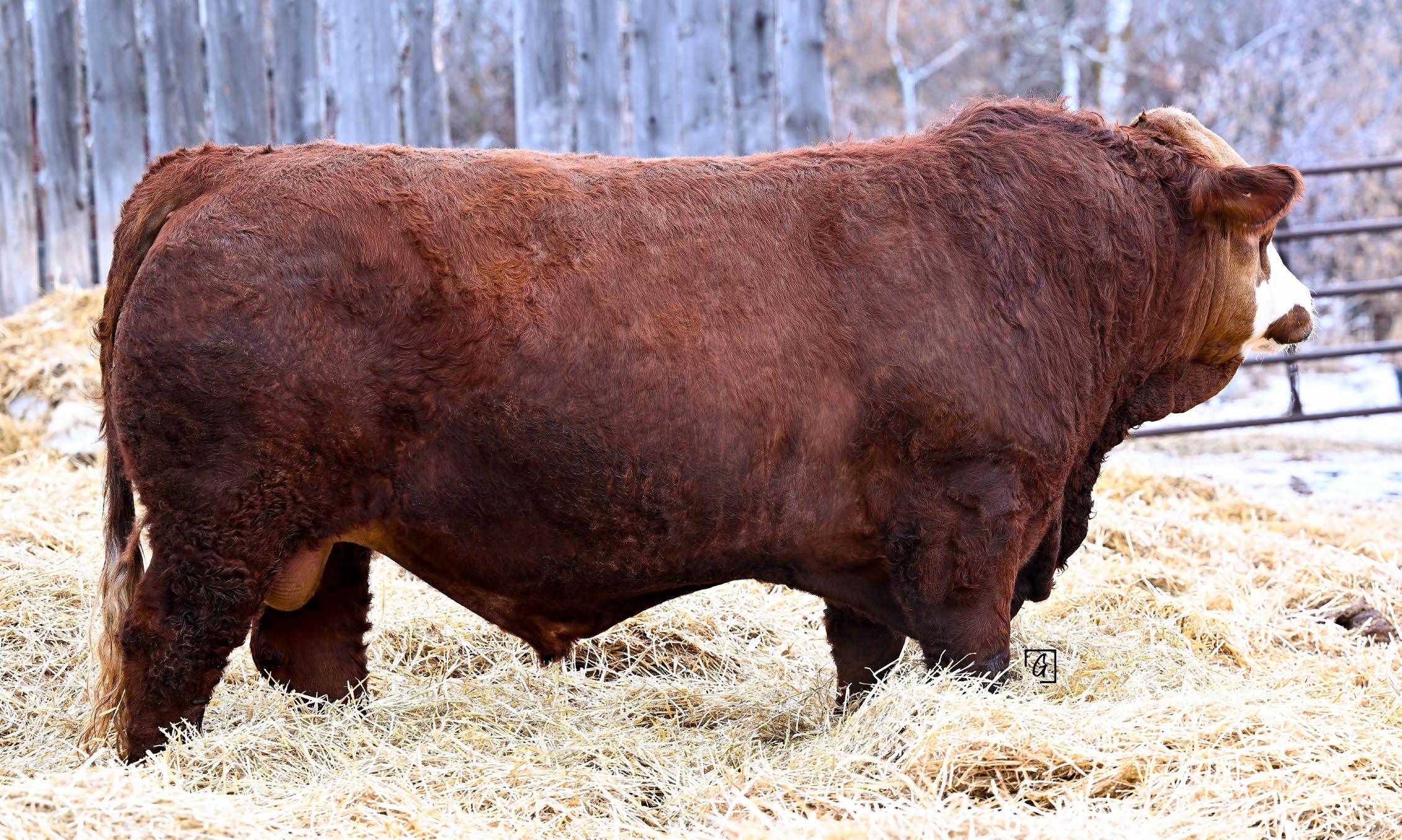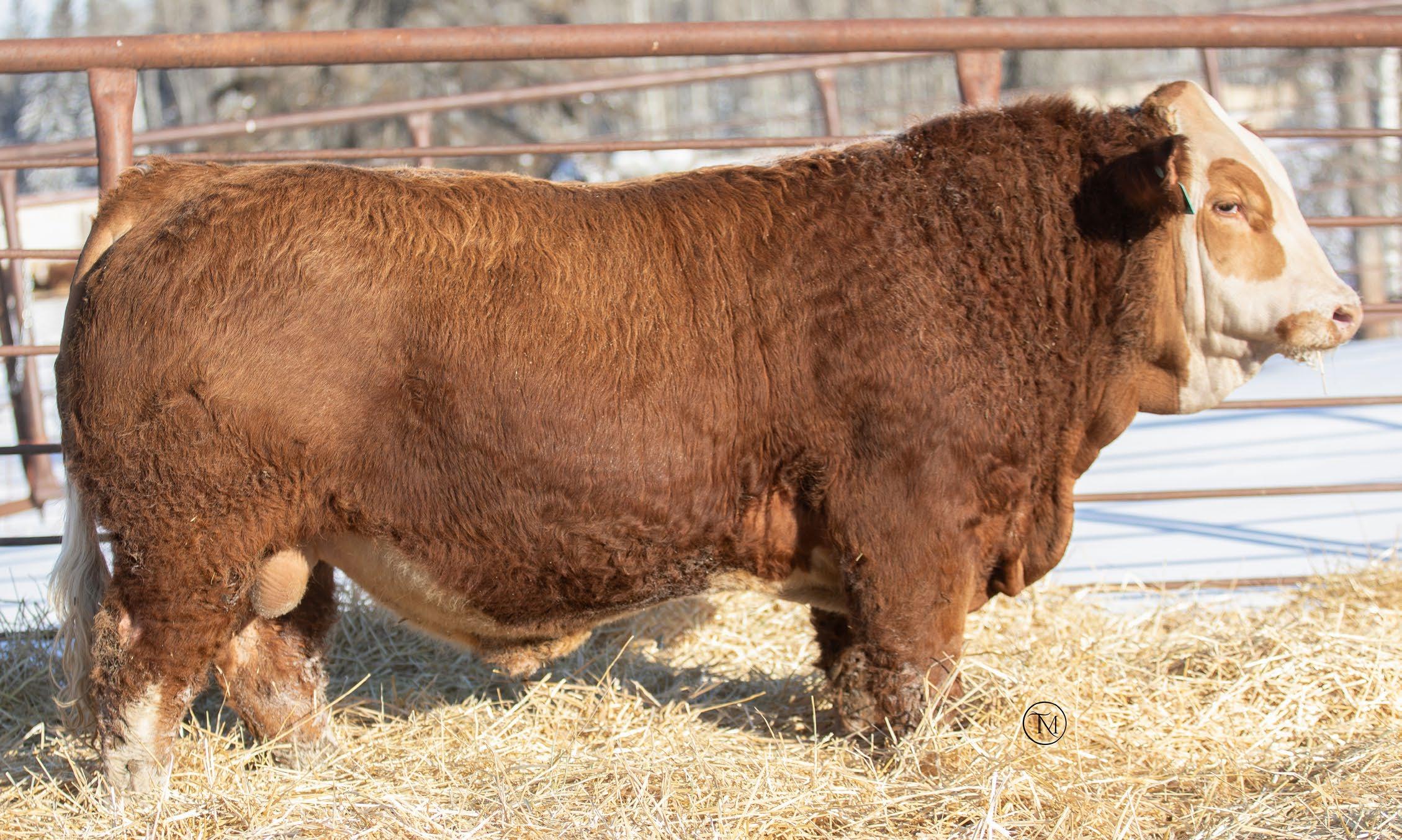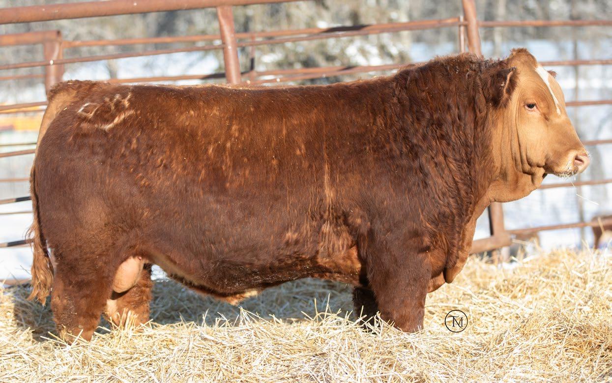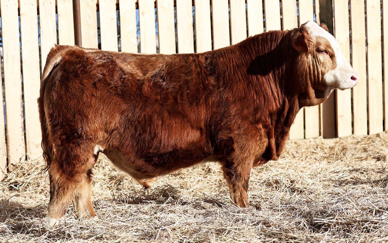 7/8 Simmental Now here is a bull who has been a standout from the moment he hit the ground! 54N is a cat on the move, long spined with fantastic natural muscling, depth of rib and capacity. His first calf dam, did an incredible job and is a young cow with a very bright future here. Her milking ability is second to none and her udder placement couldnât be better. 54N hails from the Jessie cow family which has built the Skylark herd. These cows are incredibly maternal. They do a great job and look really good doing it! 54N is a son of MRL Sleep Easy 140D and with Virginia Marquee and Kuntz Sheriff in the pedigree, there is more than ample calving ease in this bull. 54N is the perfect balance of calving ease that wont sacrifice on performance in a polled package. Honestly doesnât get much better than that!