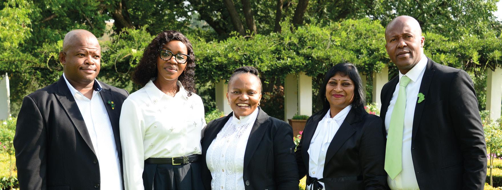 Front row (from left) is Ald. Jackie von Brandis (Executive Mayor of George) and Godfrey Louw (Acting Municipal Manager). Back row (from left): Chantel Edwards (Communication Manager), Nadine May (Social Media Officer), Debra Sauer (Communication Officer), and Ntobeko Mangwengqwe (Senior Communication Officer).