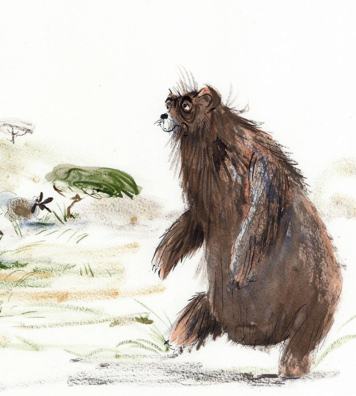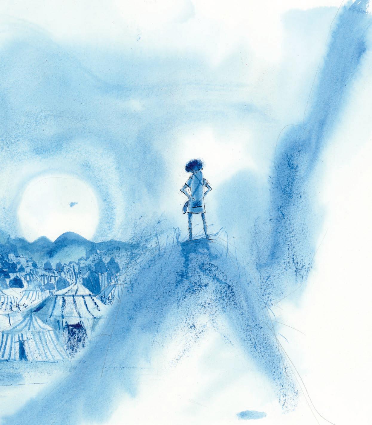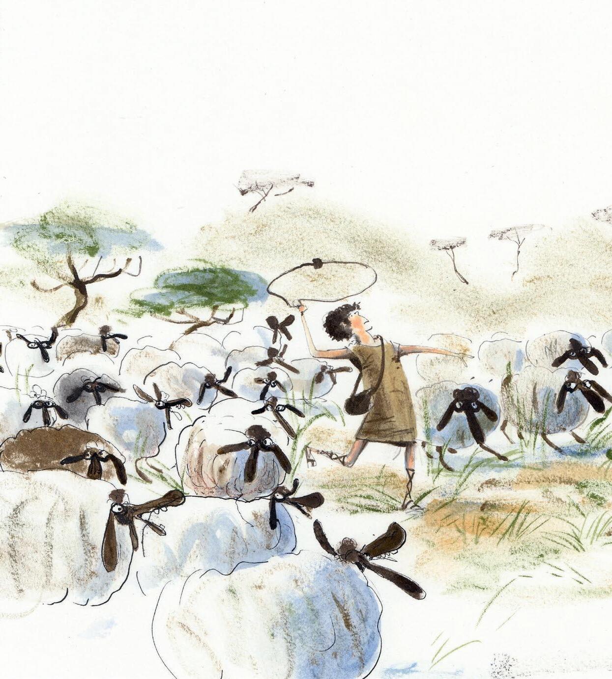 David stopt plotseling met zingen. Hij hoort iets in de bosjes. Zijn hand glijdt naar de slinger die altijd klaarligt voor je weet maar nooit. Dan, gebrul. Een beer, denkt David. Hij schiet overeind en mikt. Raak! ‘Schaapjes,’ zegt David opgelucht, ‘we gaan naar huis.’