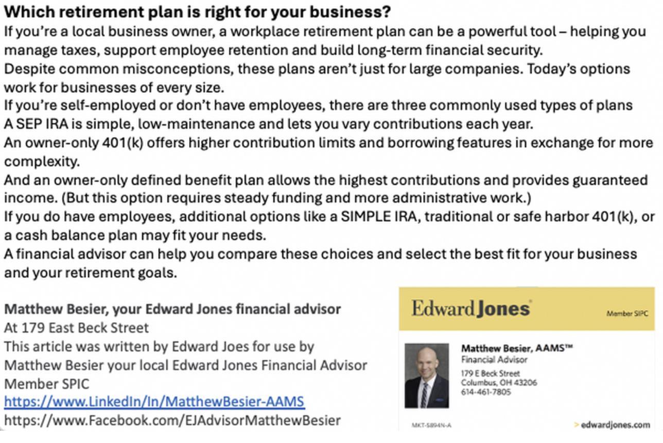 If you’re a local business owner, a workplace retirement plan can be a powerful tool – helping you manage taxes, support employee retention and build long-term financial security. Despite common misconceptions, these plans aren’t just for large companies. Today’s options work for businesses of every size.