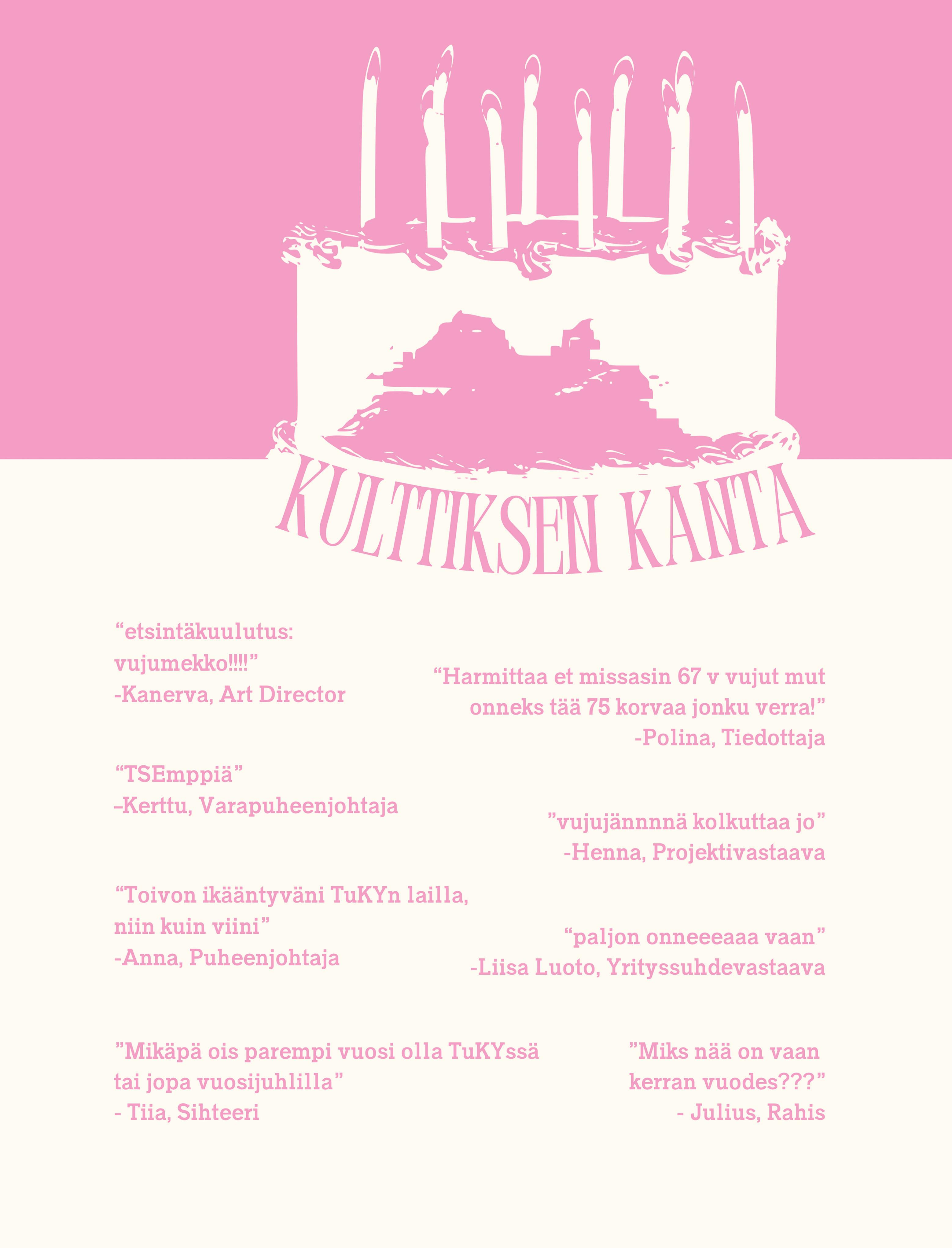 75 vuoden aikana moni asia opiskelijaelämässä ja TuKYssä on kerennyt muuttua, aina koulun sijainnista opiskelijakulttuuriin ja tapahtumiin asti. Sen rooli meidän kaikkien edunvalvojana on kuitenkin säilynyt vahvana. Vaikka ylioppilaskunta-ajoista on kerennyt kulua aikaa, tapahtumainfot saadaan paperisten viikkotiedotteiden sijaan somesta ja vendoautomaatti on ollut pois käytöstä ja aktiivisista valituksen aiheista vuosikymmeniä, näyttelevät koulutus- ja sosiaalipolitiikka kuitenkin edelleen keskeistä osaa siinä, miten saamme nauttia tästä ajasta. Code of TuKY on ollut voimassa jo neljä vuotta, alkoholikulttuuri on muuttunut valtavasti ja 6-vuotias Terve Mieli -hanke on inspiroinut mielenterveyshankkeita niin TYYssä kuin muissa kylterijärjestöissä asti. Pelkästään viimeisessä muutamassa vuodessa on siis tapahtunut jo valtavasti.
