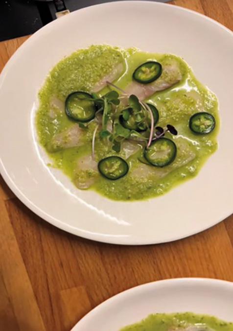 Nyt päästääki jo kokoomaan tää meidän hirvitys. Eli ahvenest pient siivuu lautaselle ja lusikal kastiketta päälle. Lopuks voit viel koristella jalapenol, korianteril ja oliiviöljyl. Mut joo, se oli siin.