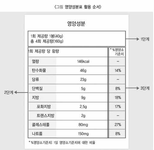 가공식품에 들어 있는 영양소의 종류와 함량을 제품 포 장에 표시하는 제도로, 소비자가 제품의 영양적 특성을 확인하여 합리적으로 제품을 선택할 수 있게 돕는 제도 입니다. 우리나라는 1996년부터 식품의약품안전처에 서 가공식품에 대한 영양성분 표시를 의무화하도록 규 정하고 있습니다.