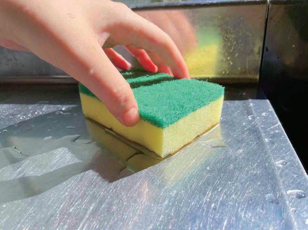 レモンを使うと、常に半分に切って、手で汁を押し出 す。このスポンジを絞る場合は、レモンジュースを押 し出すように、水を押し出す。
