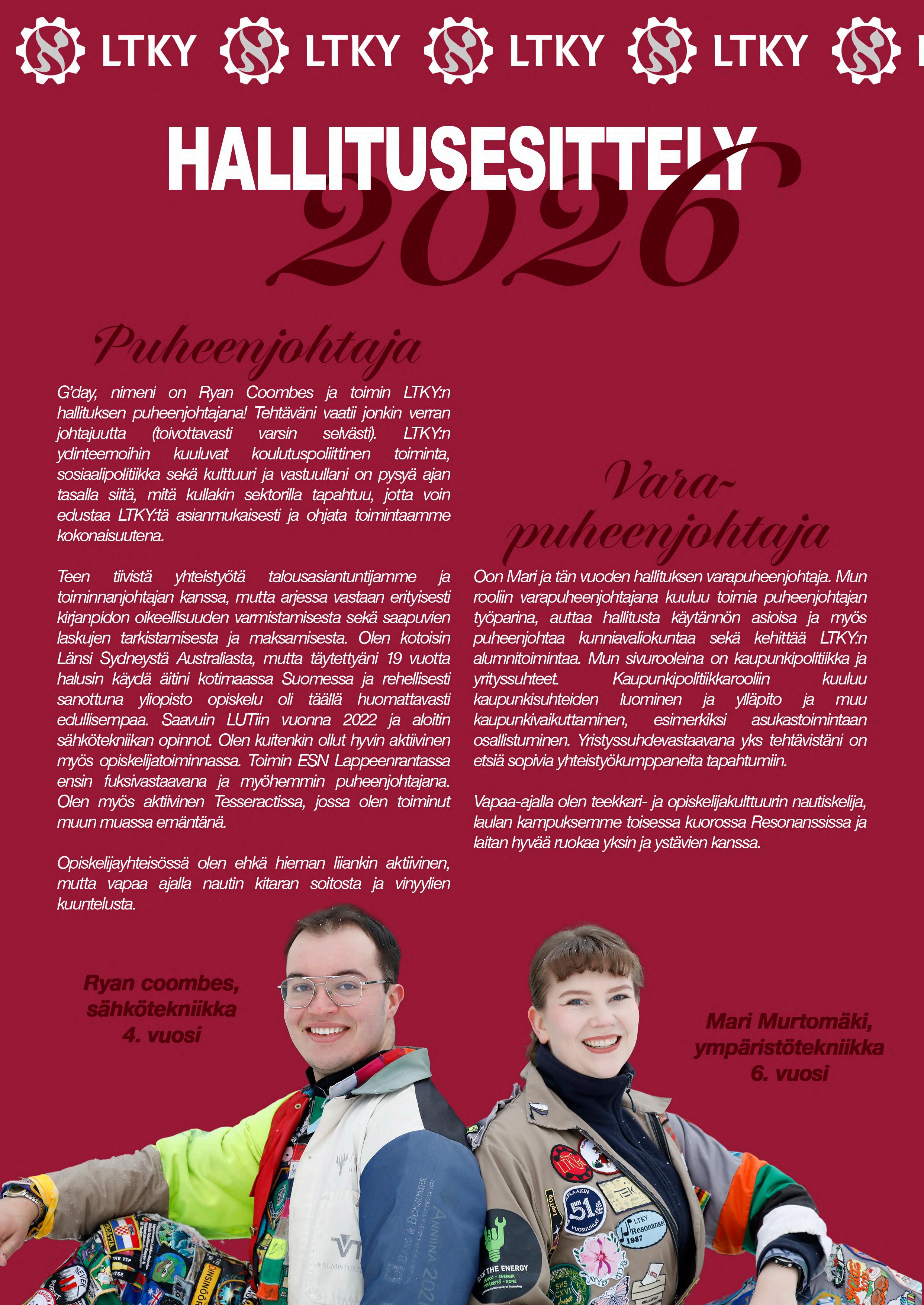 Nykyisiä LUTin opiskelijoita Maria, Veeti ja Tommi kannustavat tarttumaan rohkeasti eteen tuleviin mahdollisuuksiin. Opiskeluvuosista kannattaa myös nauttia, eikä tehdä kaikkea CV-merkintä edellä. Työnhaussa aktiivisuus on etu, mutta ei kannata lannistua, jos ei heti nappaa. Koskaan ei tiedä, mihin oma polku voi johtaa.