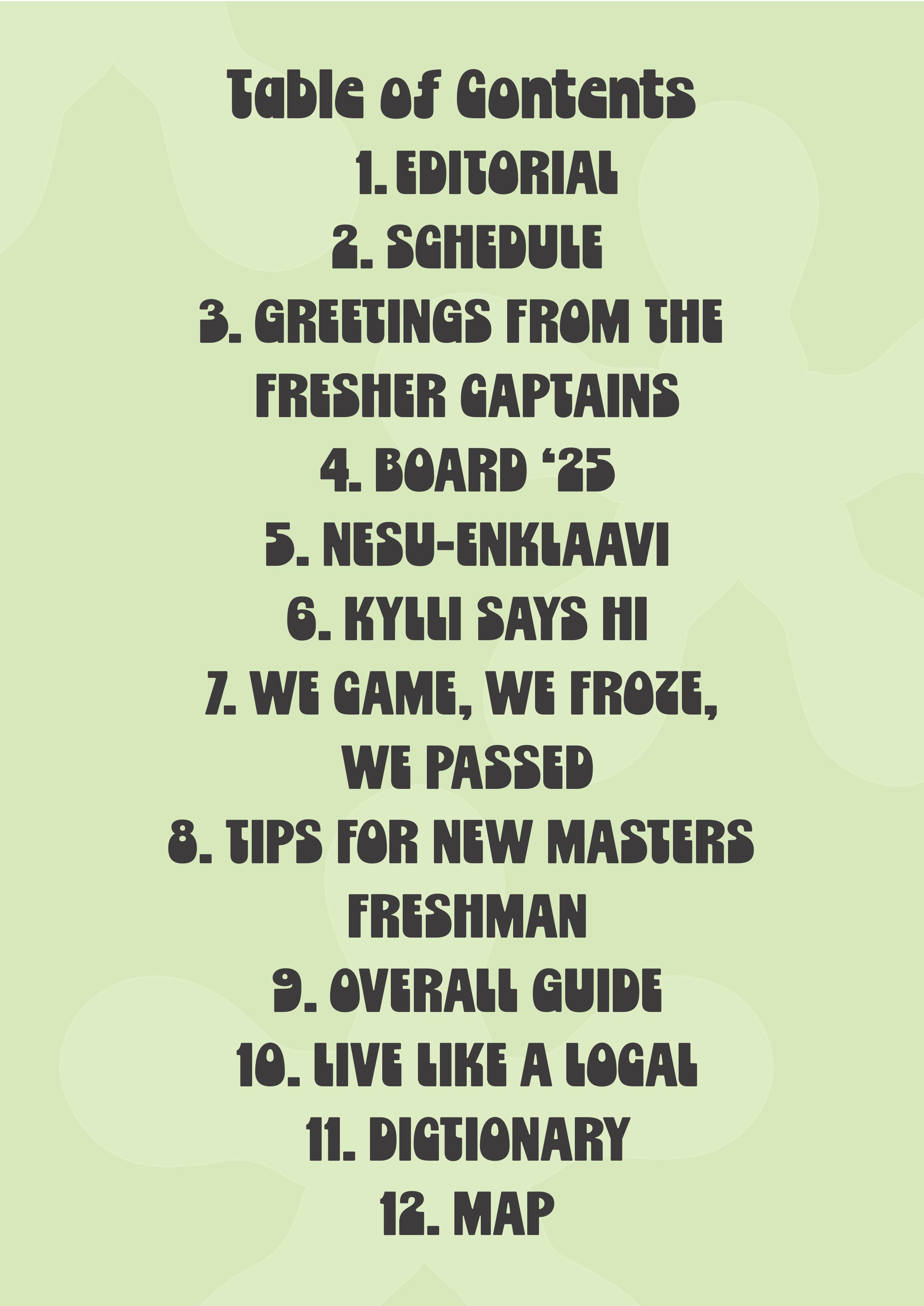 This magazine is made especially for you, our new students, and we hope it will be a helpful companion as you navigate all the exciting new things this early autumn brings. We’ve put this together with the aim of providing you with useful information and support for the first steps of your studies. Inside, you will find greetings from the Fresher Captains, tips for the overalls, and an invitation to the frehser sitz party. (You can also find more reading in the KuuttiLehti, which has been published on Issuu!)