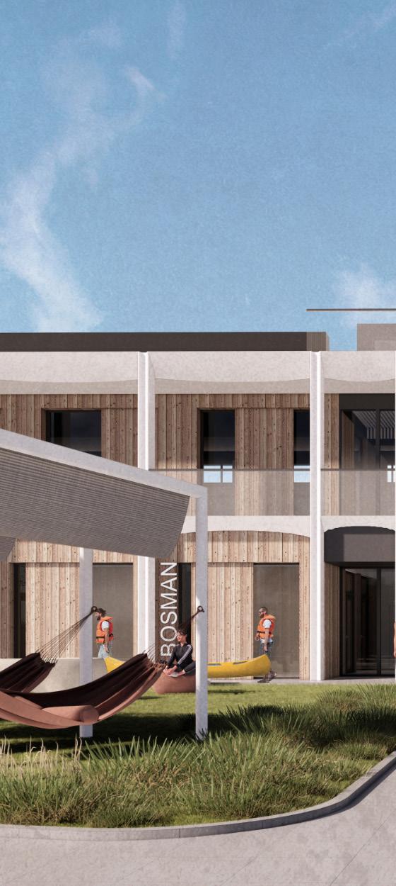 The Bosun’s building is a compact two-story rectangular structure, with an accessible roof. Its western facade features gently undulating white panels made entirely of prefabricated white architectural concrete. The largest glass opening, facing Solec Street is located under a canopy, connecting all internal levels of the lobby and offering views onto the integration square on the other side of the building. The eastern facade, finished with lye-treated larch boards, has numerous glass openings equipped with sliding shutters. The rhythm of the facade is defined by a regular arrangement of white pillars, reminiscent of sailboat masts. The white and warm tones of the wood contrast with the finish of the workshop hall, boat and kayak sheds, and rooftop structures. The southern and northern facades of the main building are predominantly designed with uniform larch wood cladding. An accessible rooftop terrace is situated on top of the Bosun’s building, featuring an educational garden in its northern section with undulating vegetation and native Vistula plant species. The building’s monochromaticity and large white surfaces serve as excellent screens for evening illumination, while during the day, they change with the shifting sunlight and shadows.