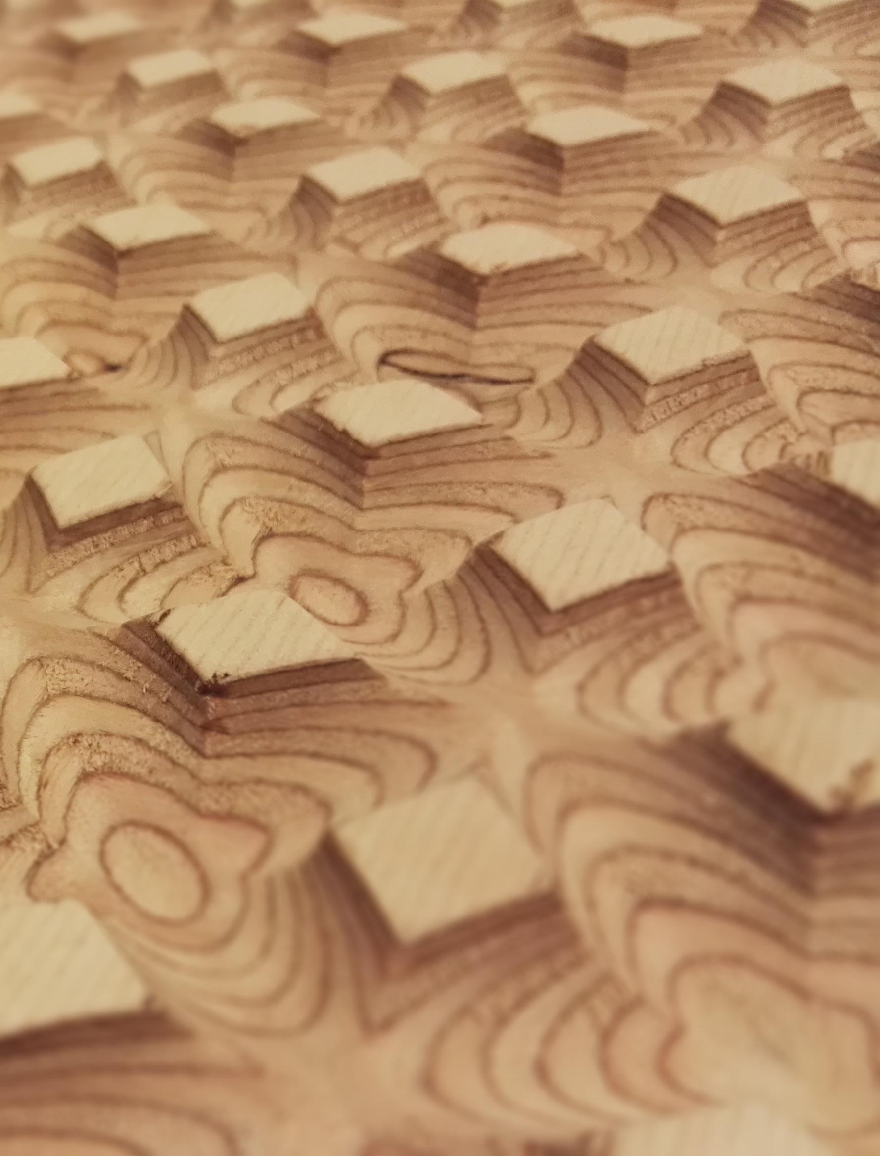Technology: Plywood acoustic panel was millled using KUKA Robot. Both pattern and robot setup was programmed with Grasshopper in Rhinoceros.
