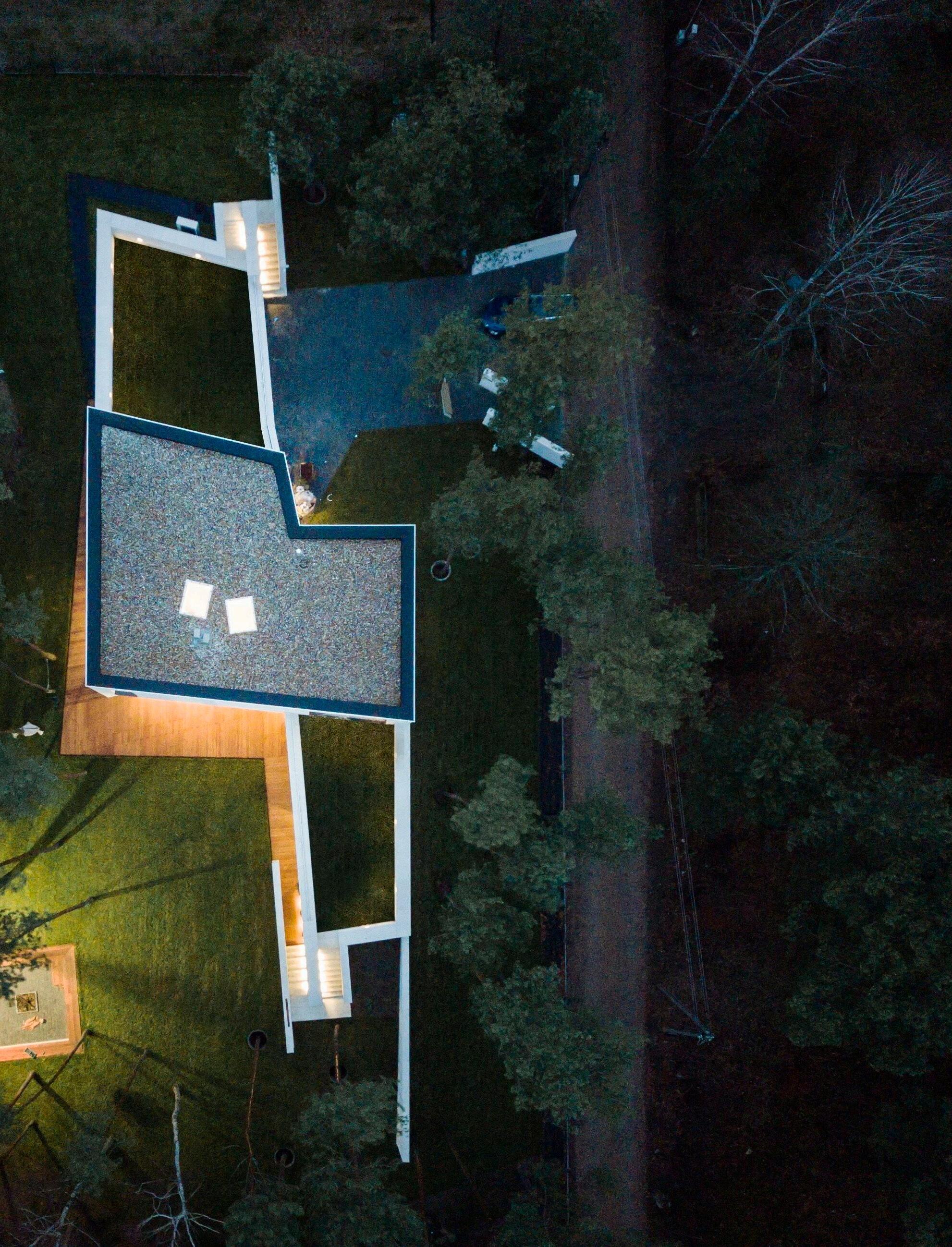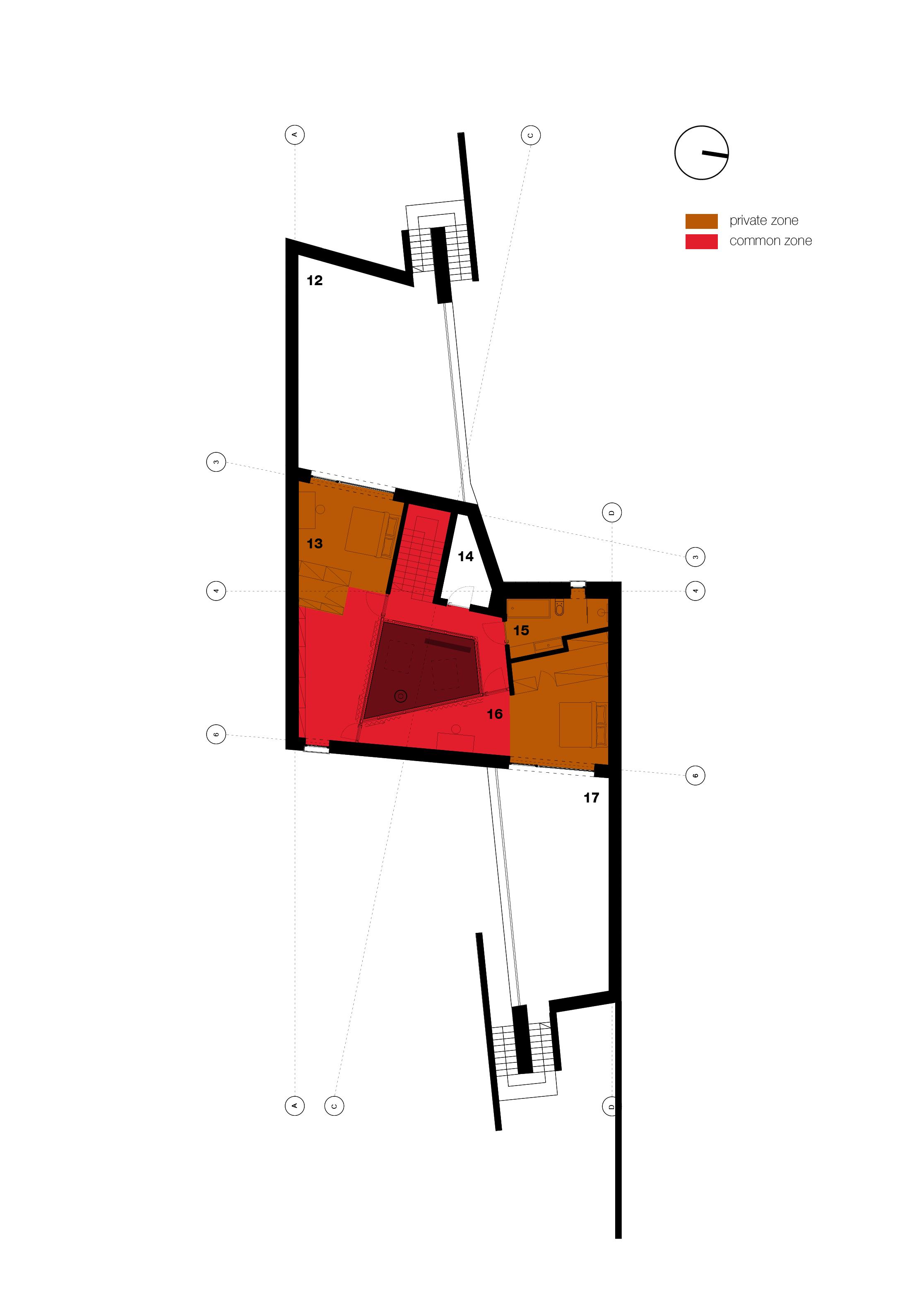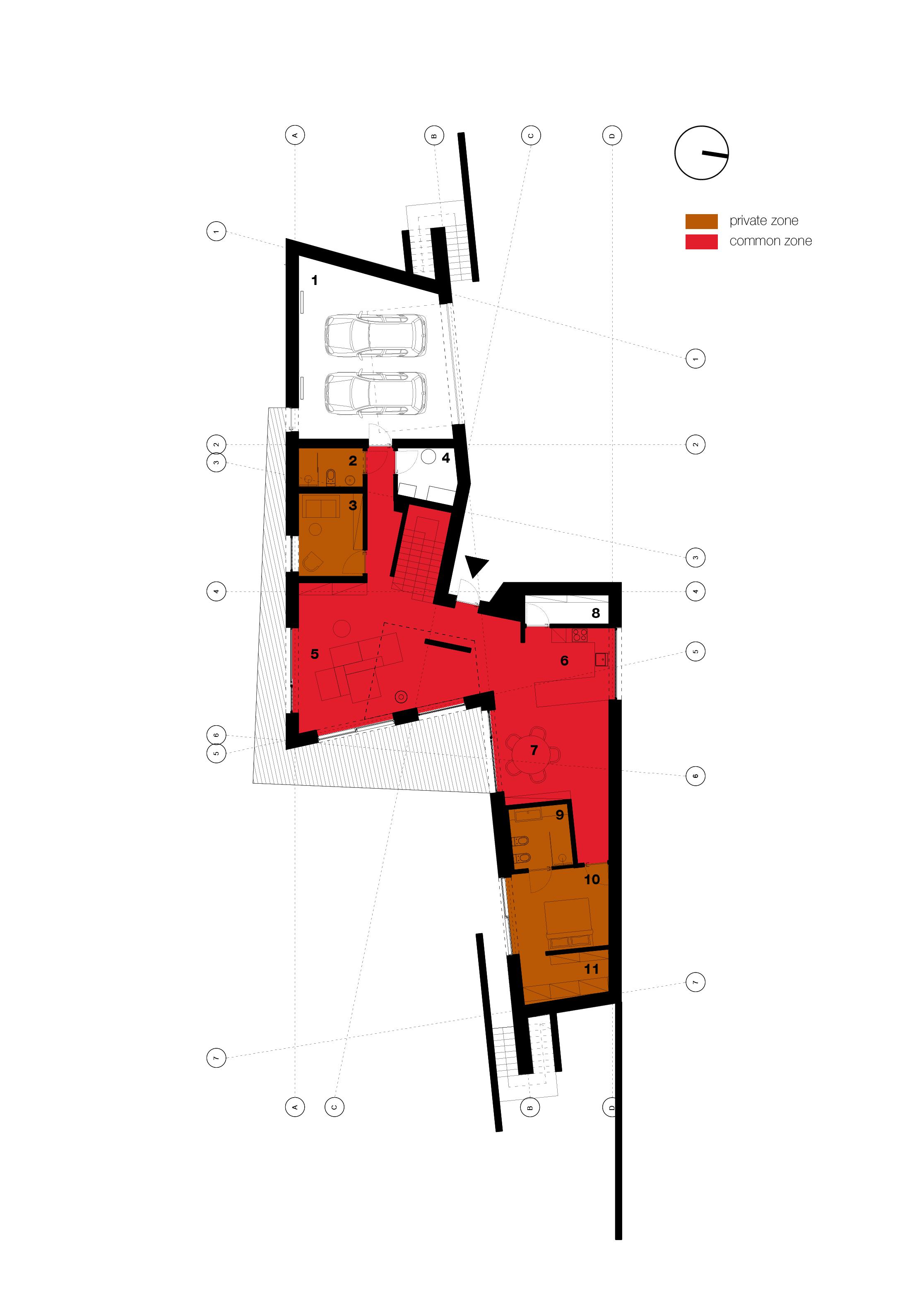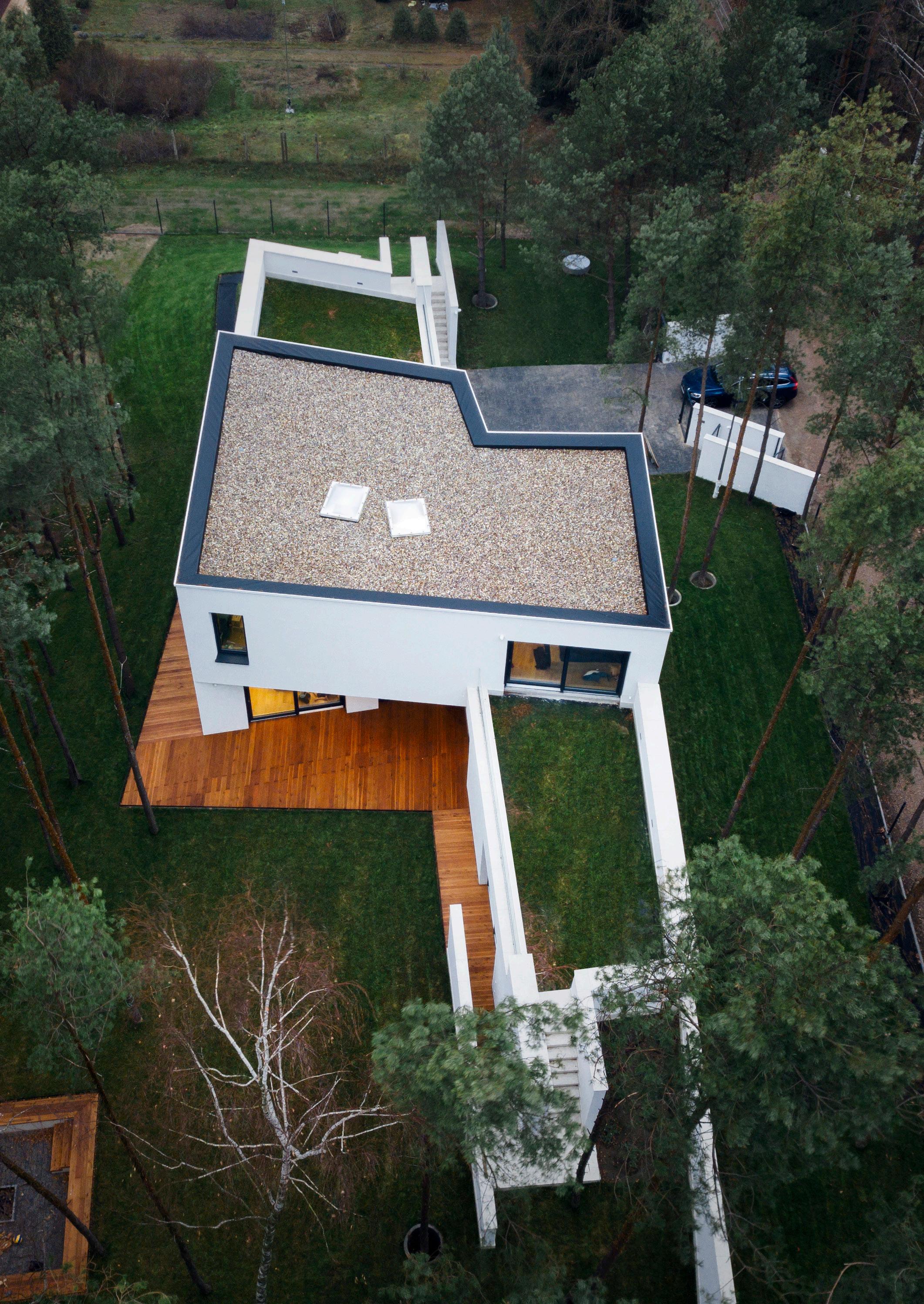 The shape of the house clearly determines the spaces for each function. Central, double-leveled part, is the common area prepared for the family gatherings. The side parts of the house contain bedrooms and technical rooms.