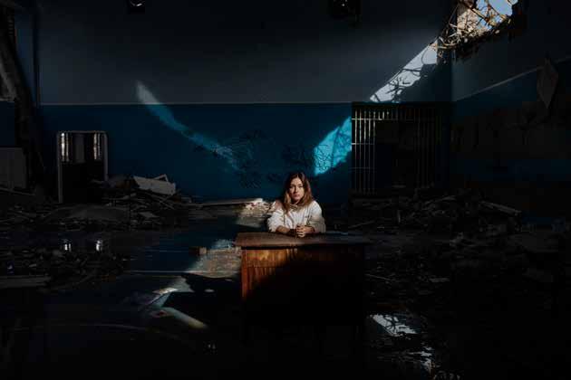 Infine una situazione di oggi. Nell’Ucraina di guerra e di occupazione, Diego Ibarra Sanchez fotografa, nella sua scuola bombardata, Daria, una delle tante donne che pur nello sconforto non si abbandonano alla disperazione, ma si dichiarano disposte a prendere le armi nella speranza di un futuro di libertà.