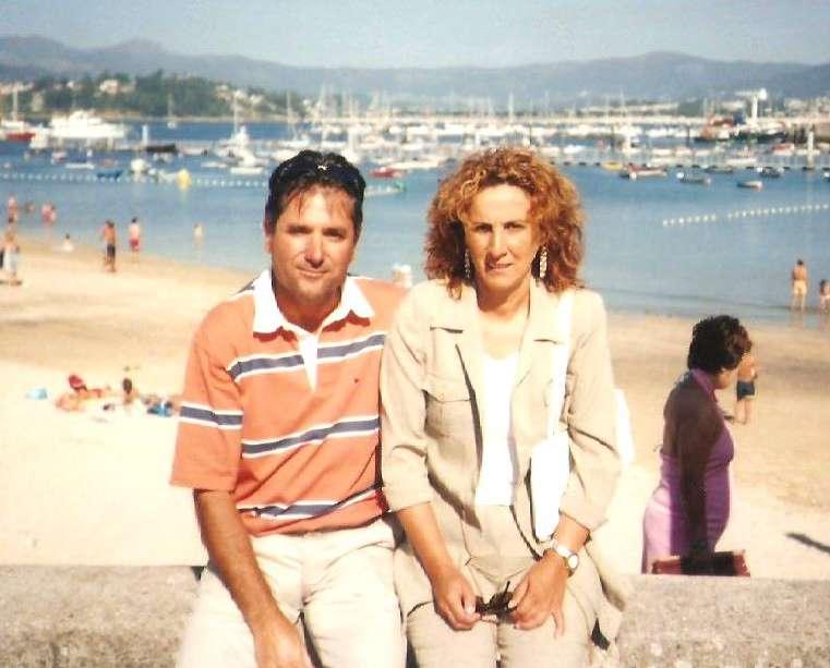 Arriba, San Antón (Baiona), 2001. “Turi”, con su hija Itziar con un año. Abajo, Praia da Barbeira (Baiona), 2001. El padre con la hija, en los primeros días de playa de la pequeña. (Archivo familia Blach Almeida).