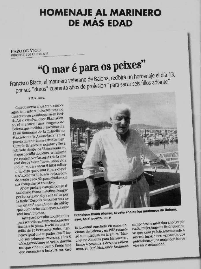 siempre muy habitada. Llegan en cambio, los momentos más descansados de sus vidas, viendo además crecer a sus nietos. Es a primeros de julio de 2014, cuando reciben la feliz sorpresa: Francisco Blach, “Dico”, va a ser homenajeado el día 13 por la “Cofradía de Pescadores “La Anunciada” -tradición en las Fiestas del Carmen-, como marinero más veterano de Baiona con 87 años, y por sus cuarenta de profesión.