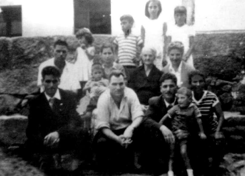Baiona, años sesenta. Reunión familiar en casa de la abuela “Lola” “Delante -cuenta un nieto-, el tío Cándido, el tío “Quirrote”, la tía Emilia y el tío “Dico”. En medio, el tío “Lolo”, “Lali”, Ángel abrazando a su madre “Gelita”, “Fran”, la abuela “Lola” y la tía Teresa. Detrás, Manolo “Coyote”, y las primas Vicenta “La Chata” y Dolores. (Archivo Familia Blach Rodríguez)