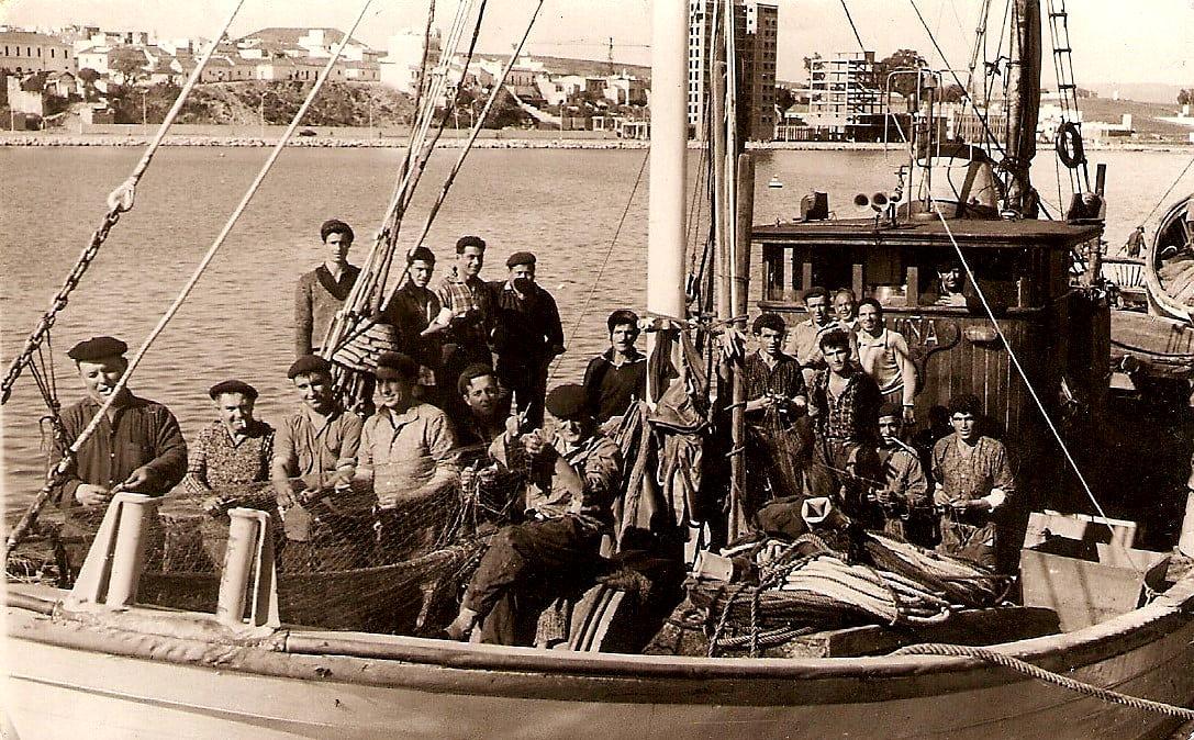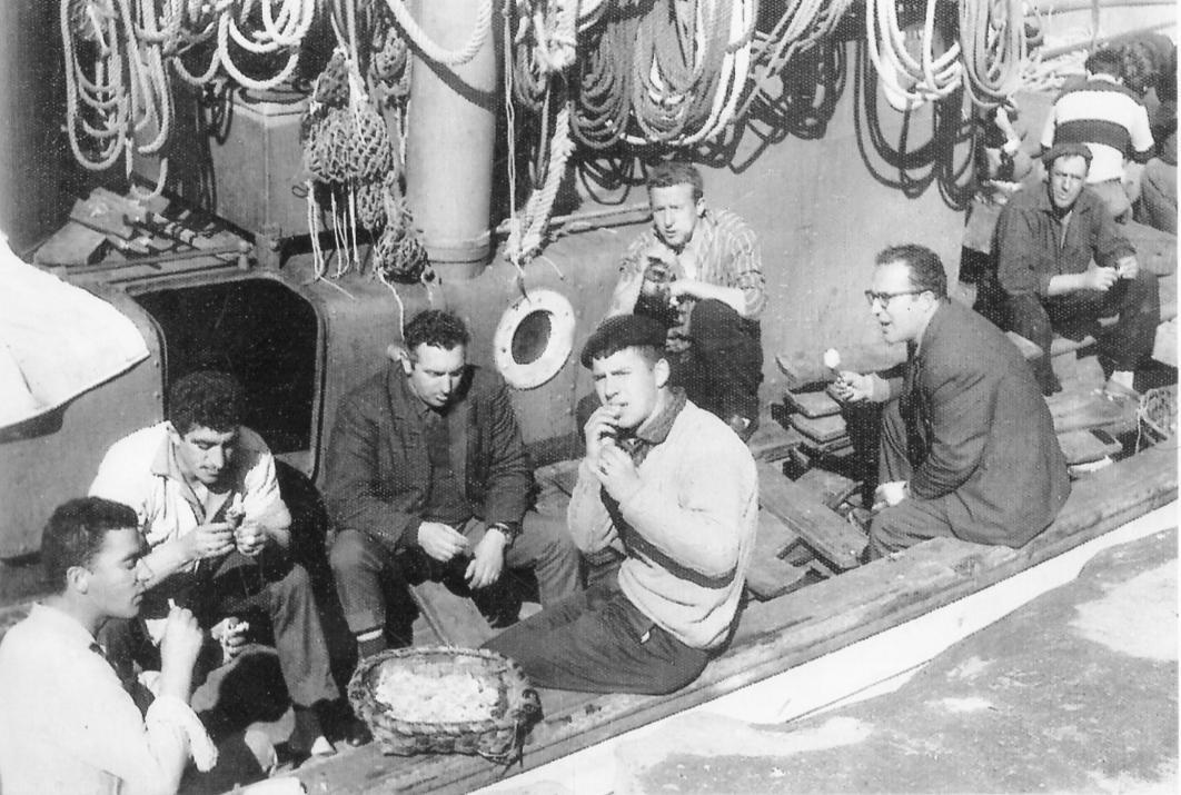 Algeciras, 1964. El “Canero”, atracado en el puerto para la descarga de merluza. Mientras tanto, reponiendo fuerzas a la hora del almuerzo: Ventura Leyenda, Eulogio Leyenda, Joaquinillo, Pablito Leyenda, el armador Pablo Leyenda, “Kiko” Leyenda y “Lanina”. El armador se trasladaba desde Baiona en una furgoneta con carrocería de madera -de moda por entonces-, para controlar los precios y la marcha de la campaña. (Archivo familia Leyenda).