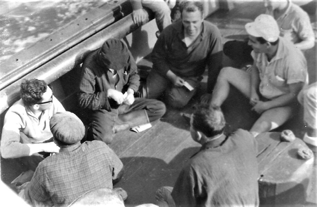 Algeciras, 1964. El “Canero”, atracado en el puerto para la descarga de merluza. Mientras tanto, marineros y visitantes reponen fuerzas a la hora del almuerzo. De izquierda a derecha: Ventura Leyenda, Eulogio Leyenda, “Joaquinillo”, Pablito Leyenda -el patrón-, el armador Pablo Leyenda, “Kiko” Leyenda y “Lanina”. (Archivo familia Leyenda Marcote).