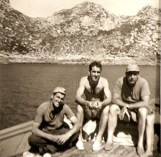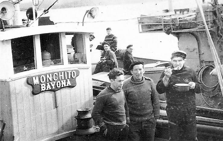 Baiona, años cincuenta. El “Monchito”, atracado en el muelle. A bordo, tres “lobos de mar”: Pepe “Capelán”, “Rachote” y Manolo “O Barros”.