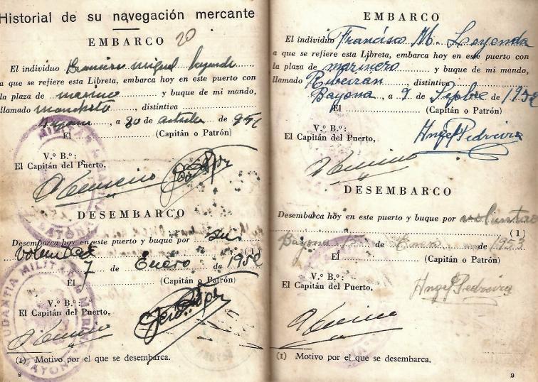 Último registro de embarque en 1993, y de desembarque en 1994, en la “Libreta de Inscripción Marítima” de Francisco Miguel Leyenda Pérez. (Archivo fam. Leyenda).
