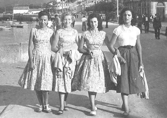 Baiona, Rúa Santa Liberata, 1958. Herminia Pérez Leyenda, Lola “A Paloma”, las hermanas Carmiña y Tonia “do Canero”, y Olga Leyenda Pérez. Por detrás se observa con claridad la bonita casa materna de “Os Canero”. (Archivo familia Rodal).