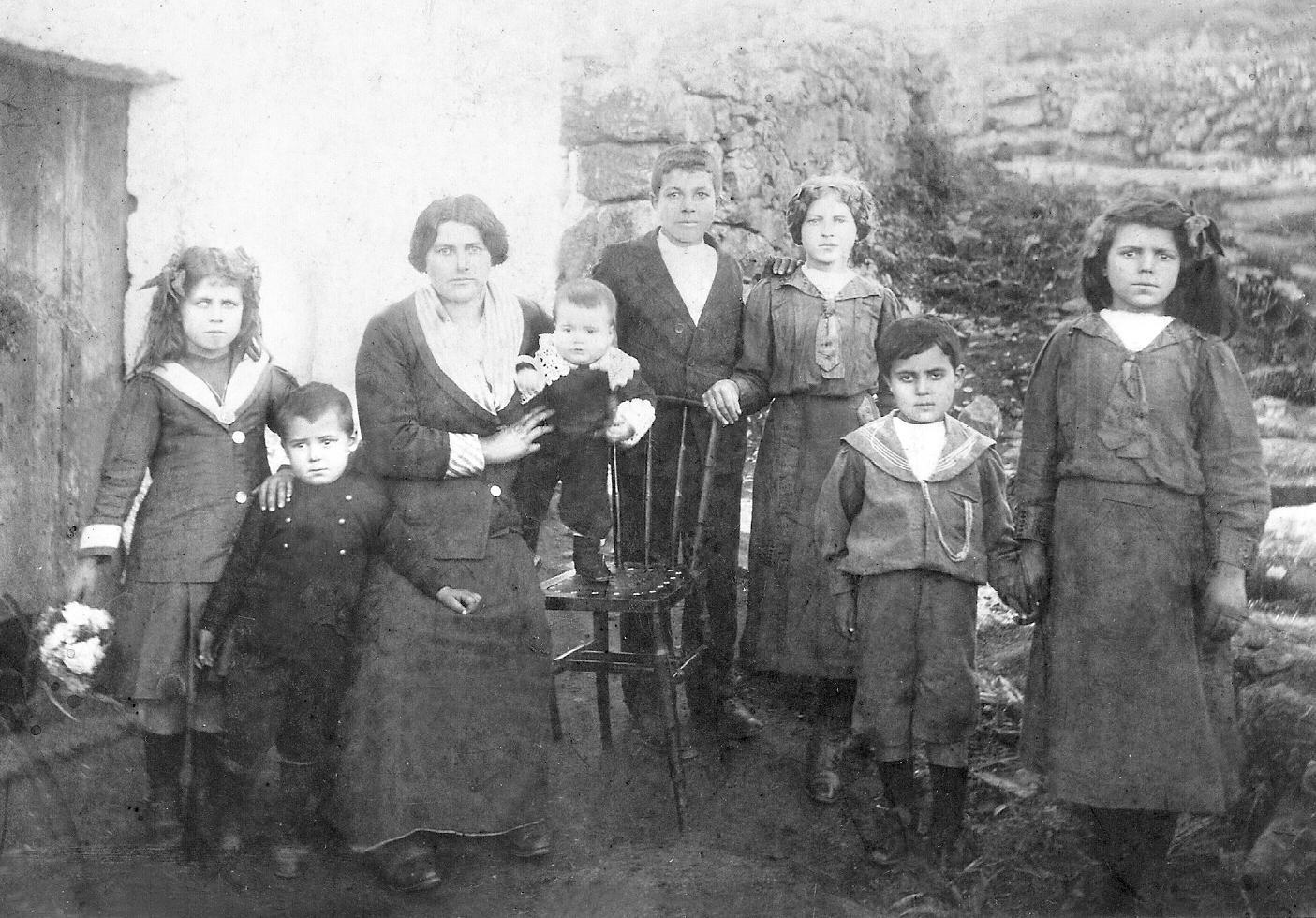 Baiona, 1914 Teresa Leyenda, “a Finura”, la madre de “O Canero”, con sus siete hijos. De izquierda a derecha: Carmen “a Rubia”, José Pérez Leyenda, Teresa, con su hijo Emilio en brazos, Ventura “O Canero”, Joaquina, Clodoaldo y Herminia Pérez Leyenda (Archivo Carmen Leyenda Leyenda).
