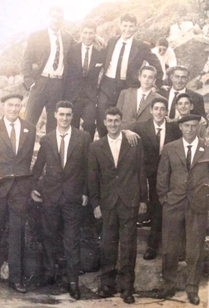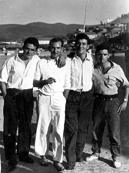 Baiona, 1959.La mayoría del grupo acaba de regresar después de un año embarcado en el “Factoría Lugo” de “Pescanova” , en la campaña del atún en Ciudad del Cabo. De izquierda a derecha: “Kiko” Leyenda -que se une a la celebración-, Suso, Pepe “Rachote”, Andrés “O Coruxeiro”, “Chucho”, Guardés, José “del Burgo” y Paulino “Chucho”. Les espera una buena comilona en A Guarda. (Archivo familia Leyenda).