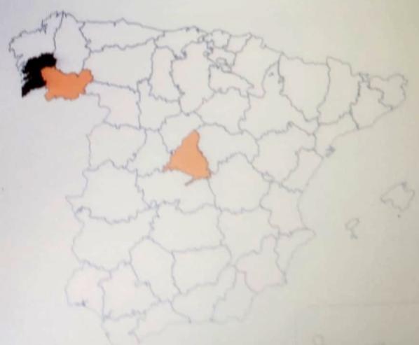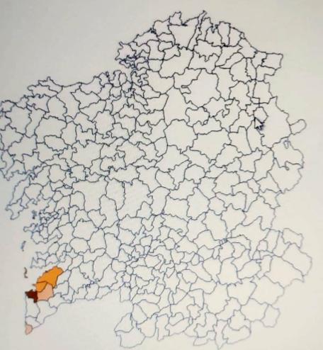 En el mapa de Galicia se señalan los concellos donde residen Leyendas: Baiona, en negro, Vigo y Nigrán, en un gris medio, y Gondomar y A Guarda, en un gris claro. En España, tan sólo en la provincia de Pontevedra -en negro-, de Ourense y de Madrid -ambas en gris-, viven Leyendas.