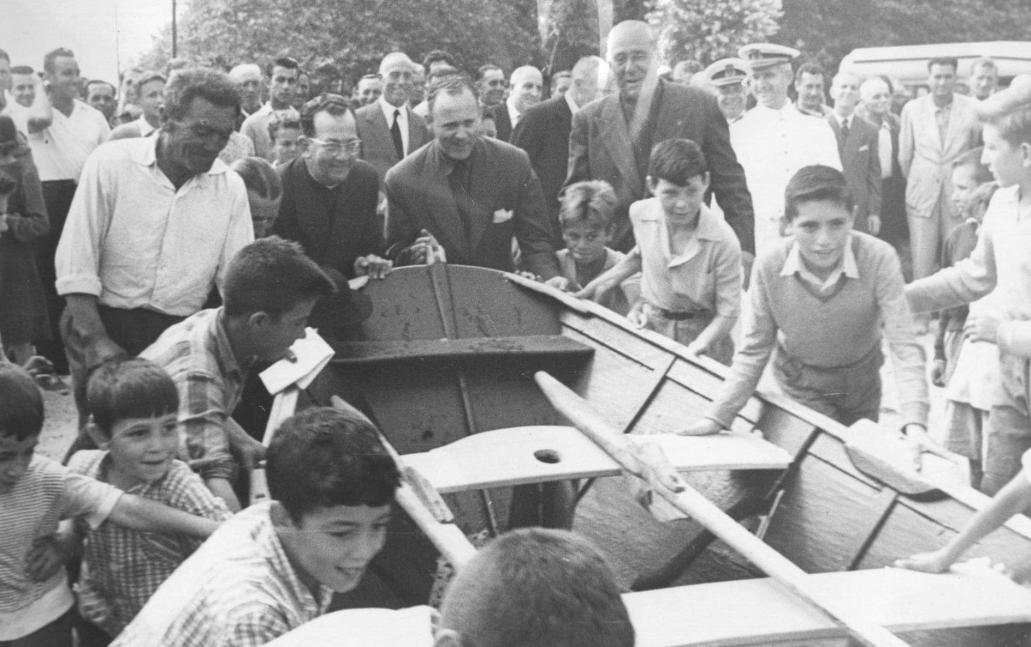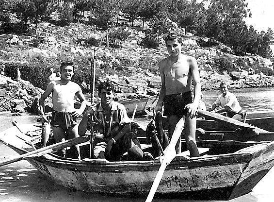 Baiona, A Ribeira, años cincuenta. En la imagen de la vieja fotografía, mucha rapazada en la gamela de Lola “A Zapatillera”: “Tino Canero”, Antonio “Xilgaro”, “Kiko” Leyenda, Eduardo “Caldeireiro”, Antonio “Airecho” y Segundo Amó.