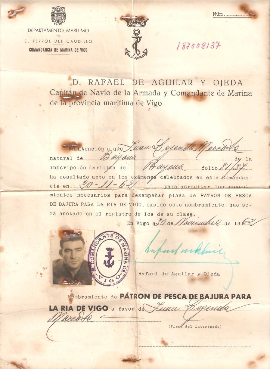 Sus hijos le sucedieron en el “Ballenato”y en el “Canero”, barcos ya de propiedad familiar, con larga trayectoria en la historia de la pesca de Baiona. Son nombres recordados por los baioneses entre aquel grupo famoso que compuso en su día la mejor flota