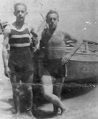 Baiona, el Rompeolas, años treinta. Ventura Leyenda, “O Canero”, con su hijo “Quin”, que no tardaría en iniciarse a la pesca con su padre, para poco después hacerse patrón del “Ballenato”, primer barco de la familia. .