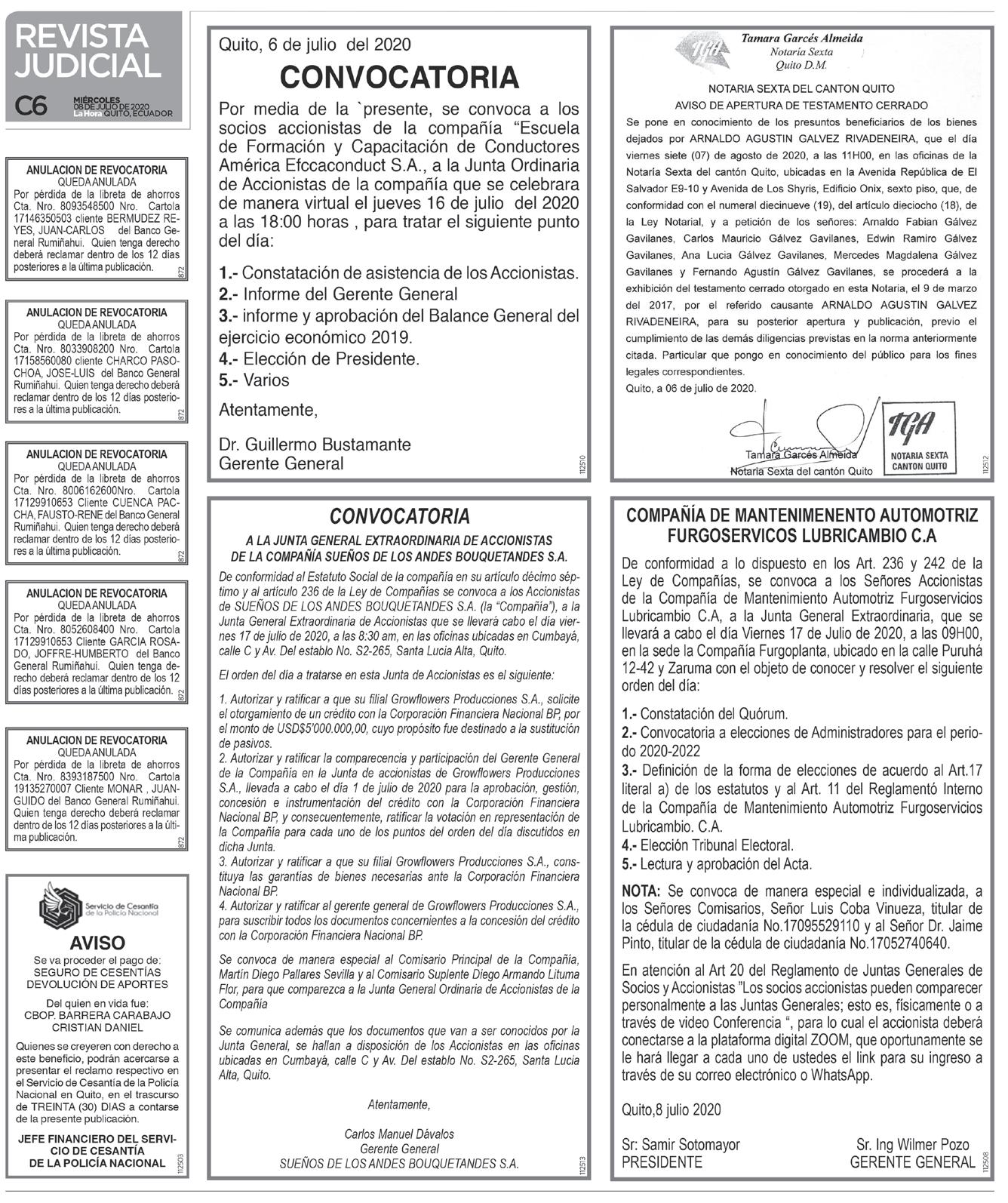 En caso de no existir quorum legal en la primera convoca toria, oportunamente se convocará por segunda vez con forme determina la Ley de Compañías.