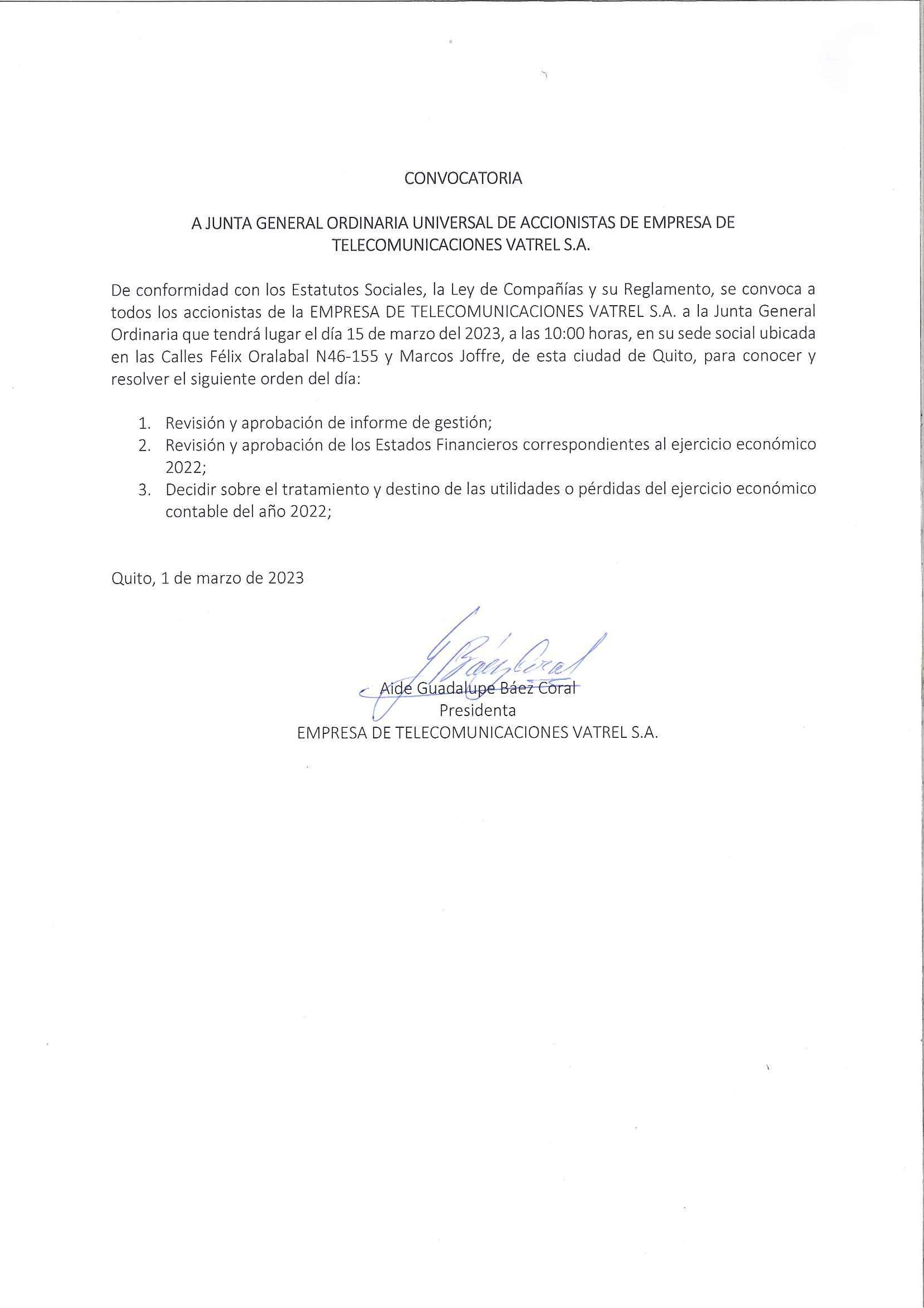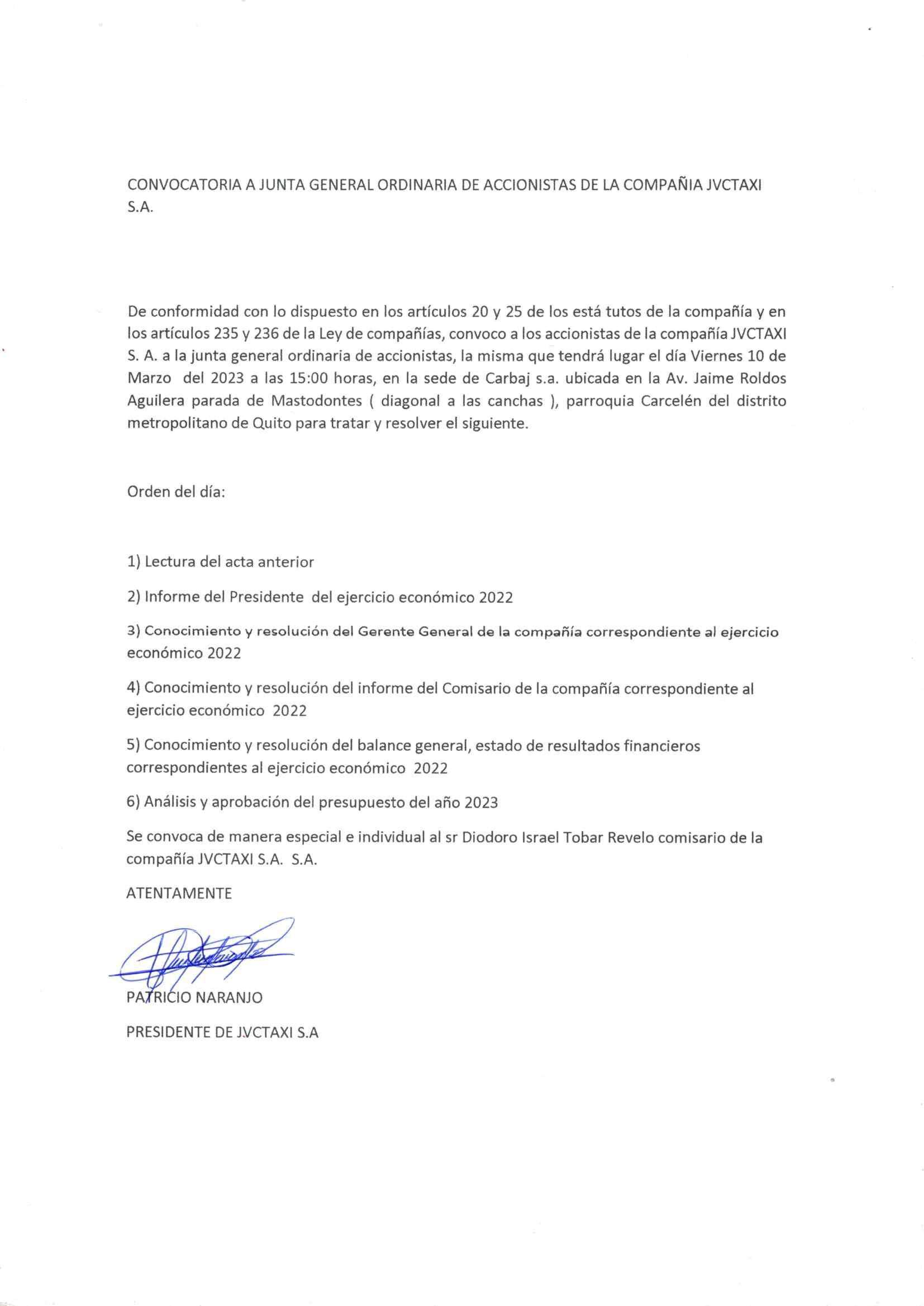 Se convoca de manera especial, personal e individualmente al Señor Pablo Deciderio Barragan Valencia con cédula de identidad N° 020147326-1, Comisario Principal de la compañía. Se pide a los socios-accionistas puntual asistencia. Los informes correspondientes y los balances y demás documentos fnancieros del ejercicio económico 2022 se encuentran a disposición de los accionistas en la ofcina de la compañía con su debida antelación para el conocimiento de los mismos.