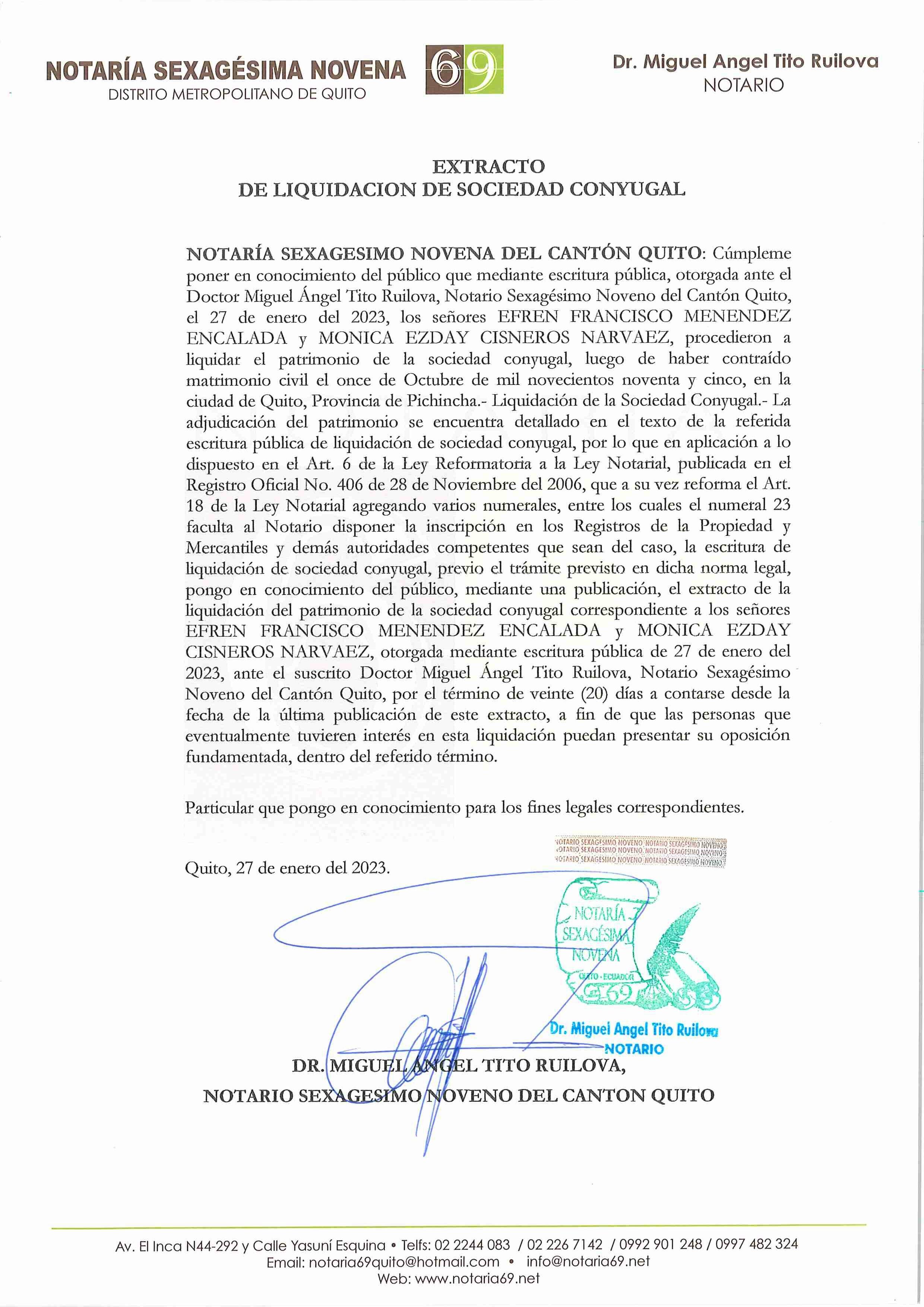 FECHA Y NOTARIA: 23 de enero del 2023, con número de protocolo 20231701027P00084, ante la NOTARIA VIGÉSIMA SÉPTIMA DEL CANTÓN QUITO Doctora Mónica Elizabeth Maldonado Nieto.-