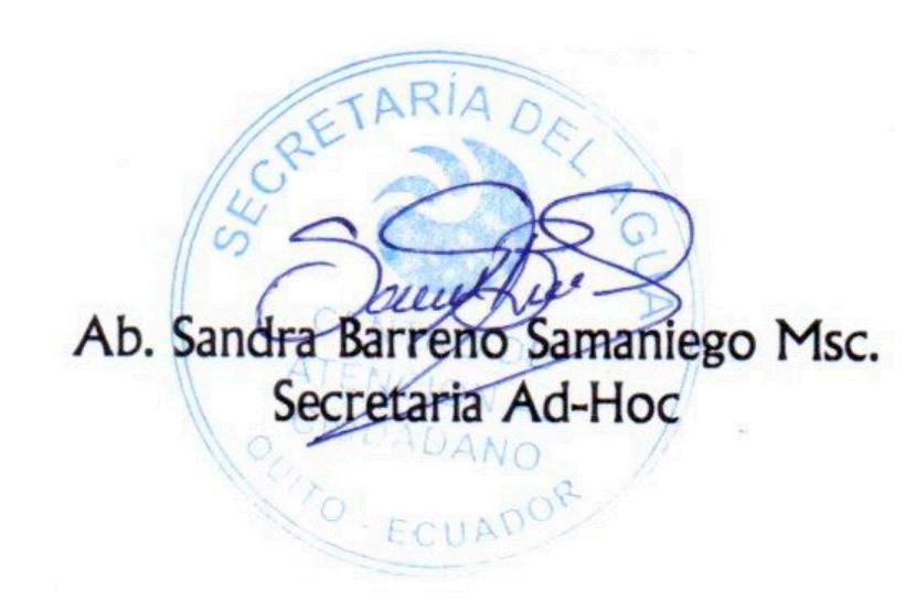 MINISTERIO DEL AMBIENTE, AGUA Y TRANSICION ECOLOGICA, DIRECCION ZONAL 2 ESMERALDAS, OFICINA TÉCNICA DE QUITO. - Proceso Administrativo N.- 67-2021 Au (SB).- Quito, 20 de julio de 2023.- A las 11h30.- VISTOS.- Avoco conocimiento del presente trámite administrativo en mi calidad de Director Zonal de Esmeraldas del Ministerio del Ambiente y Agua, en virtud de la Acción Personal Nro. 0767 de fecha 15 de junio de 2021. Que mediante Decreto Ejecutivo Nro. 1007 de 04 de marzo de 2020, el Presidente Constitucional de la República decreta la fusión del Ministerio del Ambiente (MAE) y la Secretaría del Agua (Senagua) en una sola institución denominada Ministerio de Ambiente y Agua. Que mediante Acuerdo Ministerial Nro. MAAE2020-023 de fecha 28 de agosto de 2020, se aprueba el Estatuto Orgánico de Gestión Organizacional por Procesos del Ministerio del Ambiente y Agua, MAAE, en el Nivel Desconcentrado, Directores Zonales. En lo principal: 1.- Comparece a la Dirección Zonal 2 Esmeraldas, el ab. Luis Eduardo Sosa Cruz, Gerente General de Cía. GUAISA S.A., de fecha 17 de octubre de 2022, manifestado: AUTORIZAR e/ Uso y Aprovechamiento de las Aguas que discurren por la Quebrada conocida como Hda. Guacha/á, o denominada Rio Cangahua, de acuerdo a las Cartas Topográficas del IGM., jurisdicción de la parroquia de Cangahua, cantón Cayambe, en el caudal de 20 1/s., o el que el señor Perito me designe luego de la inspección Técnica, para destinarlas a servicio de riego del predio denominado Hacienda San Cristóbal, de propiedad de la compañía “GUANGUILQUI AGROPECUARIA INDUSTRIAL S.A. GUAISA” ubicado en la parroquia de Cangahua, cantón Cayambe, provincia de Pichincha; a captarse aproximadamente en la cota 2.846 msnm., en el sitio de coordenadas PSAD 56:9´998.600 N y 814.976 E.; a Una cota inferior, con respecto a la obra de captación de las aguas existente en el cauce, que permite el servicio a las comunidades de: Santa Rosa y Santa Marianita de Pingulmi. Para el aprovechamiento de las aguas, a más de la obra de captación, se requerirá de la construcción de un sistema de bombeo, a ubicarse al pie de la propiedad de la compañía, la misma que colinda con el río Cangahua, por su margen derecha. Razón por la cual, solicito que mediante la Resolución respectiva se Establezcan las correspondientes servidumbres forzosas de captación, conducción y sus conexas Para e óptimo aprovechamiento del recurso hídrico, se construirán las obras de conformidad con las especificaciones técnicas recomendadas por el Perito que intervenga en la realización del estudio técnico de mi petición. A la solicitud se le dará el trámite establecido en el Reglamento Genera/ de Aplicación a la Ley Orgánica de Recursos Hídricos, Usos y Aprovechamiento del agua; para la diligencia de fijación de los carteles, como para la notificación a los señores Presidentes de las dos comunidades mencionadas, para efectos de su conocimiento, por cuanto se respetarán sus caudales autorizados a favor de las respectivas comunidades, se comisionará al Señor Teniente Político de la Parroquia de Cangahua. 2.- Agréguese al expediente el escrito presentado por el ab. Luis Eduardo Sosa Cruz, Gerente General de Cía. GUAISA S.A., de fecha 18 de octubre de 2022, manifestado: Por un error involuntario no hice constar el nombre del señor Presidente de l Junta de Riego Santa Rosa y Santa Marianita de Pingulmi, señor Alfonso Salvador Guaras como el Presidente de la Comuna Santa Marianita de Pingulmi señor Edgar Saavedra, a fin de que comparezcan al proceso en el caso de ser necesario, para ello se remitirá los correspondientes oficios al señor Teniente Político de la parroquia Cangahua, a fin de que proceda a citarles. Autoriza al ab. Renato Soria Viteri, para que de manera individual presente cuatro escritos y posiciones sean necesarias en beneficio de mis intereses, los correos electrónicos: renarosoria @hotmail. com, ccanarte@comreivic.com, para sus notificaciones. Con estos antecedentes esta Autoridad Administrativa Dispone 1.- Se acepta la solicitud y en apego a lo dispuesto en los Arts. 57, 58, 71, 86, 90, 94, 95, 123 Y 126 de la Ley Orgánica de los Recursos Hídricos usos Y Aprovechamientos del Agua, en concordancia con lo prescrito en el Art. 107 del Reglamento, se la califica a trámite, por el procedimiento General. 2.- Por lo dispuesto en el Art. 107 numeral 3 del Reglamento a la Ley Orgánica de Recurso Hídricos. Notifíquese con la solicitud y la presente providencia a los usuarios conocidos y desconocidos mediante publicación de un extracto de la solicitud y esta providencia, publicaciones que se lo deberá realizar en un periódico de circulación de la localidad, de no existir se lo realizará en un periódico de circulación nacional, por tres veces consecutivas; y, Fíjese carteles durante diez días consecutivos en tres lugares más concurridos de la Parroquia Cangahua, Cantón Cayambe, Provincia de Pichincha. Notifíquese a los señores: Alfonso Salvador Guaras Presidente de la Junta de Riego Santa Rosa y Santa Marianita de Pingulmi, y señor Edgar Saavedra Presidente de la Comuna Santa Marianita de Pingulmi, a fin de que comparezcan al proceso en el caso de ser necesario. Para lo cual se remitirá atenta comisión librada al señor Teniente Político de la mencionada jurisdicción. 3. Téngase en cuenta la autorización concedida al Ab. Renato Soria Viteri y los correos electrónicos renarosoria @hotmail.com, ccanarte@comreivic.com, de conformidad a lo dispuesto en los Arts. 2 y 56 de la Ley de Comercio Electrónico, Firmas y Mensajes de Datos, en concordancia con el Art. 165 del Código Orgánico Administrativo COA. 4. Previniéndole que en caso de no realizarse la misma, por cuestiones imputables al administrado, y transcurrido el plazo de dos meses se declara el abandono y posterior archivo de conformidad al Art. 212 del Código Orgánico Administrativo, Actúe como Secretaria Ad-Hoc,