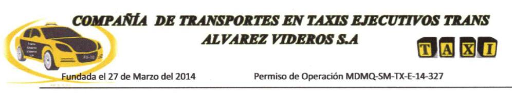 De conformidad en lo establecido en el Art. 236 de la ley de Compañías y los Art. 7, 9,12 y 20 del estado social de la COMPAÑIA DE TRANSPORTE EN TAXIS EJECUTIVOS TRANS ALVAREZ VIDEROS S.A., Se convoca a la Junta General Ordinaria que se llevara a cabo el día jueves 16 de Febrero del 2023 a las 18:30 horas en las instalaciones dela compañía situada en la Avenida Gribaldo Miño. Parroquia Conocoto, distrito Metropolitano de Quito, para tratar los siguientes puntos del ORDEN DEL DIA.