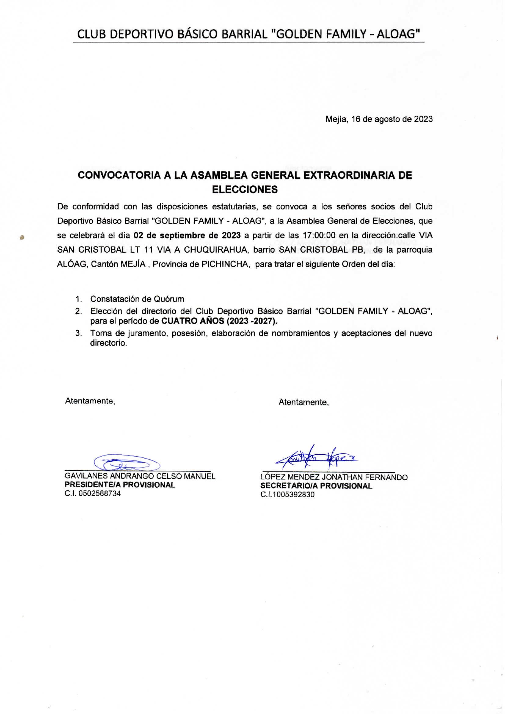 Por medio de la presente, amparado en lo que disponen los artículos 15,16 y 17 del Reglamento Sustitutivo al Reglamento General de la Ley del Deporte, Educación Física y Recreación, así como, en lo establecido por los artículos 22, 23 y 24 del Estatuto de nuestra institución CONVOCO a la ASAMBLEA GENERAL DE ELECCIONES de Liga Deportiva Barrial Manuelita Sáenz en la cual se elegirá al Directorio de la Institución para el periodo 2023-2027, a realizarse el día viernes 1 de septiembre del año en curso a las 19:00 horas en la sede de nuestra Institución ubicada en la calle Oe9 (pasaje 16) s/n y S54 (interior del complejo deportivo), para lo cual deberán realizar la acreditación obligatoria de dos directivos o delegados (art. 19 Estatuto LDBMS), adjuntado copias de cédula y papeleta de votación actualizada a color, copia de los estatutos y registro de los nombramientos, con el siguiente orden del día: