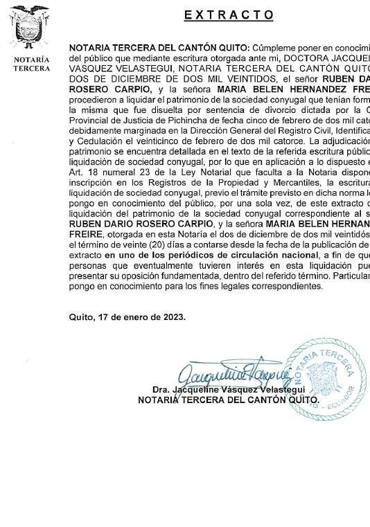 Jacqueline Espinosa Ruiz Gerente General Dra. Jacqueline Vásquez VelásteguiNOTARIA TERCERA DEL CANTÓN QUITO: Cúmpleme poner en conocimiento del público que mediante escritura otorgada ante mi, DOCTORA JACQUELINE VASQUEZ VELASTEGUI, NOTARIA TERCERA DEL CANTÓN QUITO, el DOS DE RUBEN MARIA BELEN procedieron a liquidar el patrimonio de la sociedad conyugal que tenían formada, la misma que fue disuelta por sentencia de divorcio dictada por la Corte Provincial de Justicia de Pichincha de fecha cinco de febrero de dos mil catorce, debidamente marginada en la Dirección General del Registro Civil, Identificación y Cedulación el veinticinco de febrero de dos mil catorce. La adjudicación del patrimonio se encuentra detallada en el texto de la referida escritura pública de liquidación de sociedad conyugal, por lo que en aplicación a lo dispuesto en el Art. 18 numeral 23 de la Ley Notarial que faculta a la Notaria disponer la inscripción en los Registros de la Propiedad y Mercantiles, la escritura de liquidación de sociedad conyugal, previo el trámite previsto en dicha norma legal, pongo en conocimiento del público, por una sola vez, de este extracto de la liquidación del patrimonio de RUBEN DARIO