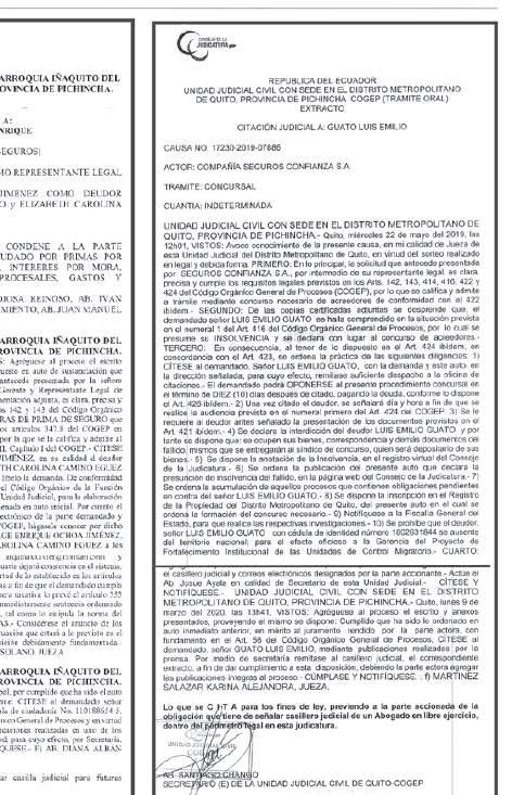 UNIDAD JUDICIAL PENAL CON SEDE EN LA PARROQUIA IÑAQUITO DEL DISTRITO METROPOLITANO DE QUITO, PROVINCIA DE PICHINCHA.- 1.- PRIMERA LOS QUERELLADOS SON: MILTON ORLANDO ESPINEL PUGA REPRESENTANTE LEGAL DE IMPORTADORA MUNDO LED ECUADOR. SEGUNDA.- DETERMINACIÓN DE LA INFRACCIÓN DE QUE SE LE ACUSA.- Al querellado por haber incumplido las obligaciones de servicios ofrecidos y se establezca indemnización por daños y perjuicios.- TERCERA.- RELACIÓN CIRCUNSTANCIADA DE LA INFRACCIÓN, CON DETERMINACIÓN DEL LUGAR Y LA FECHA EN QUE SE COMETIÓ.- 1.- Con fecha 20 de diciembre compre un televisor marca LG de 50 pulgadas modelo UP77, en la tienda comercial IMPORTADORA MUNDO LED ECUADOR, quien tiene publicidad en mercado libre y redes sociales como Facebook, Instagram donde asegura que sus productos son de buena calidad (...) mi peor experiencia en la compra de estos equipos (...) decidí comprar el televisor el día 20 de diciembre del 2021 (...) solicite al señor Milton Orlando Espinel me devolviera el valor cancelado por el televisor (...) se me informo que el televisor estaba en el técnico que cualquier momento puedo ir a revisar (...)a pesar de 203070539-DFE reiterados nunca se me dio la dirección para ir a retirar (...) no he tenido ningún pronunciamiento del vendedor y representante de la empresa (...). Incorpórese al expediente el oficio No. MDI-VSC-SDMDSM-2023-7935-OF, suscrito por control migratorio. 2.- Agréguese al expediente el escrito presentado por el señor RAFAEL ANDRÉS CUADRADO VILLACIS, de 08 de mayo del 2023 en atención al mismo en lo principal se dispone: Una vez que se ha realizado el trámite correspondiente para realizar la citación y por cuanto, de la oficina de citaciones se ha remitido la certificación de no citación, en virtud de lo expuesto y de conformidad al Artículo 56. 1 del CODIGO ORGANICO GENERAL DE PROCESOS, que indica “...Citación a través de uno de los medios de comunicación. A la persona o personas cuya individualidad, domicilio o residencia sea imposible determinar, se la citará mediante: 1. Publicaciones que se realizarán en tres fechas distintas, en un periódico de amplia circulación del lugar. De no haberlo, se harán en un periódico de la capital de provincia, asimismo de amplia circulación. Si tampoco hay allí, en uno de amplia circulación nacional. La publicación contendrá un extracto de la demanda o solicitud pertinente y de la providencia respectiva. Las publicaciones íntegras se agregarán al proceso...”, se dispone: PRIMERO.- El señor RAFAEL ANDRÉS CUADRADO VILLACIS, concurrió a esta Unidad Judicial Penal, el día 24 de abril del 2023, a reconocer firma y rubrica y juramento de su escrito con respecto a la parte en la que indica “...Por lo expuesto, dado que desconozco el paradero del denunciado, así como me es imposible determinar el lugar donde se encuentra el mismo, pues actuando en contra de los principios de buena fe y lealtad procesal el denunciado está ocultando su paradero y domicilio, para NO ser notificado, de conformidad con lo que dispone el Art. 648 del Código Orgánico Integral Penal (COIP), SOLICITO, se sirva ordenar la CITACIÓN POR LA PRENSA del denunciado...” diligencia que se llevó a cabo en la Unidad Judicial Penal con sede en la parroquia Iñaquito en la fecha señalada.- SEGUNDO: Una vez que se ha dado cumplimiento a la diligencia de reconocimiento de firma y rubrica y juramento por parte del señor RAFAEL ANDRÉS CUADRADO VILLACIS, se dispone CITAR, al señor MILTON ORLANDO ESPINEL PUGA, con el contenido de la denuncia o su parte principal, extracto que será entregado por secretaria, dicha citación se deberá realizara a través de la prensa, esto es, en tres días distintos en un diario de mayor circulación del País, a costas del peticionario, quien una vez que haya dado cumplimiento con lo dispuesto por esta autoridad, remitirá a esta autoridad los diarios de fechas distintas donde conste el extracto de la citación .- Actúe el Luis Huilcapi, en calidad de secretario encargado de esta Unidad Judicial Penal.- CUMPLASE Y NOTIFIQUESE.